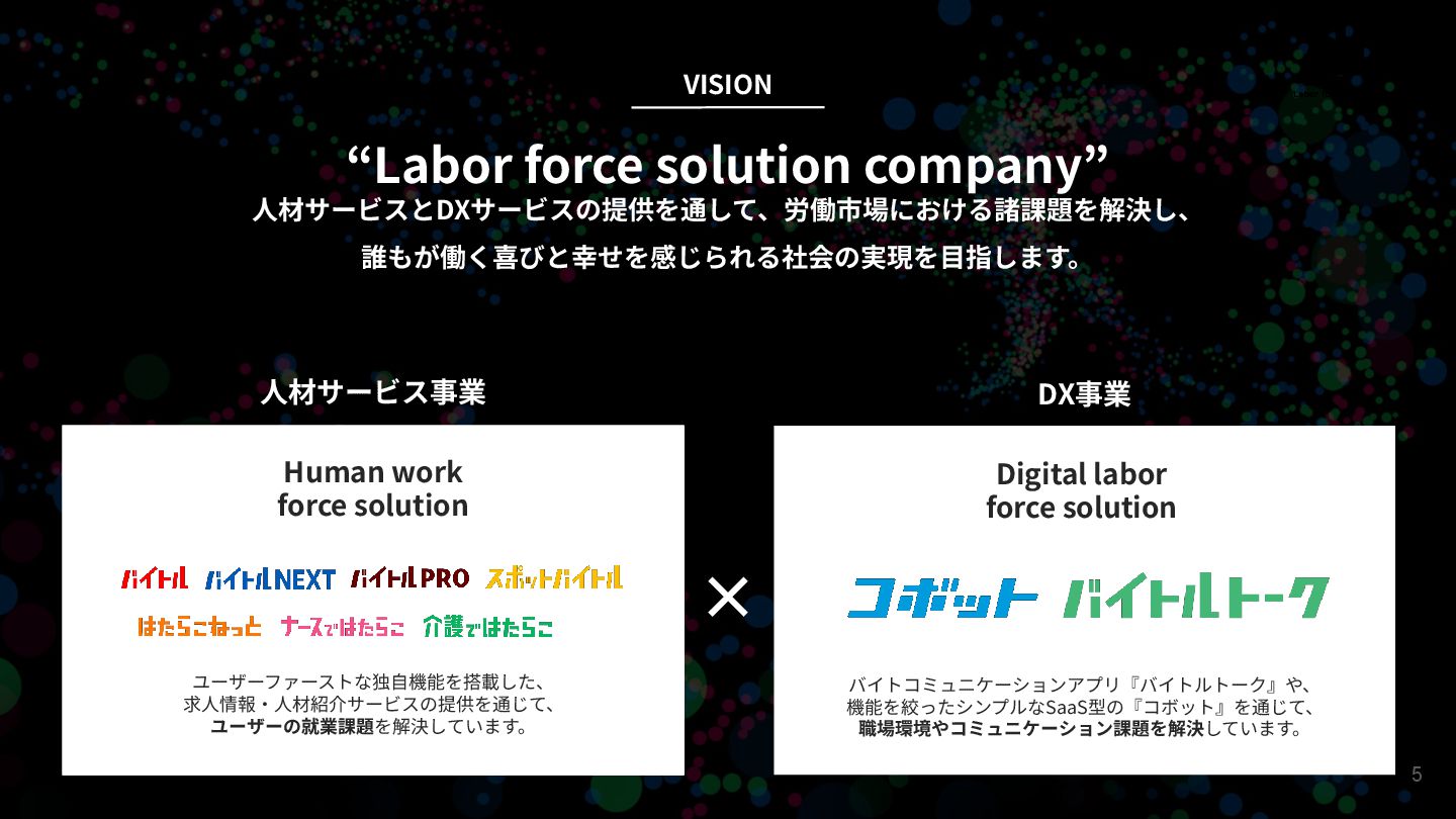 × “Labor force solution company” ⼈材サービスとDXサービスの提供を通して、労働市場における諸課題を解決し、 誰もが働く喜びと幸せを感じられる社会の実現を⽬指します。 VISION Human work