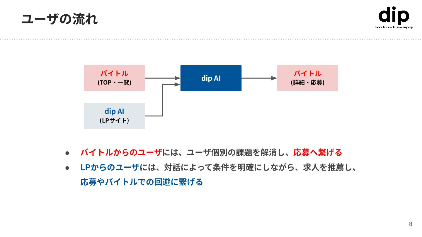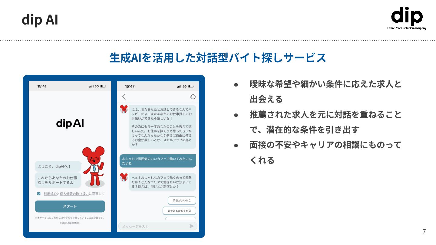 dip AI ⽣成AIを活⽤した対話型バイト探しサービス • 曖昧な希望や細かい条件に応えた求⼈と 出会える • 推薦された求⼈を元に対話を重ねること で、潜在的な条件を引き出す •