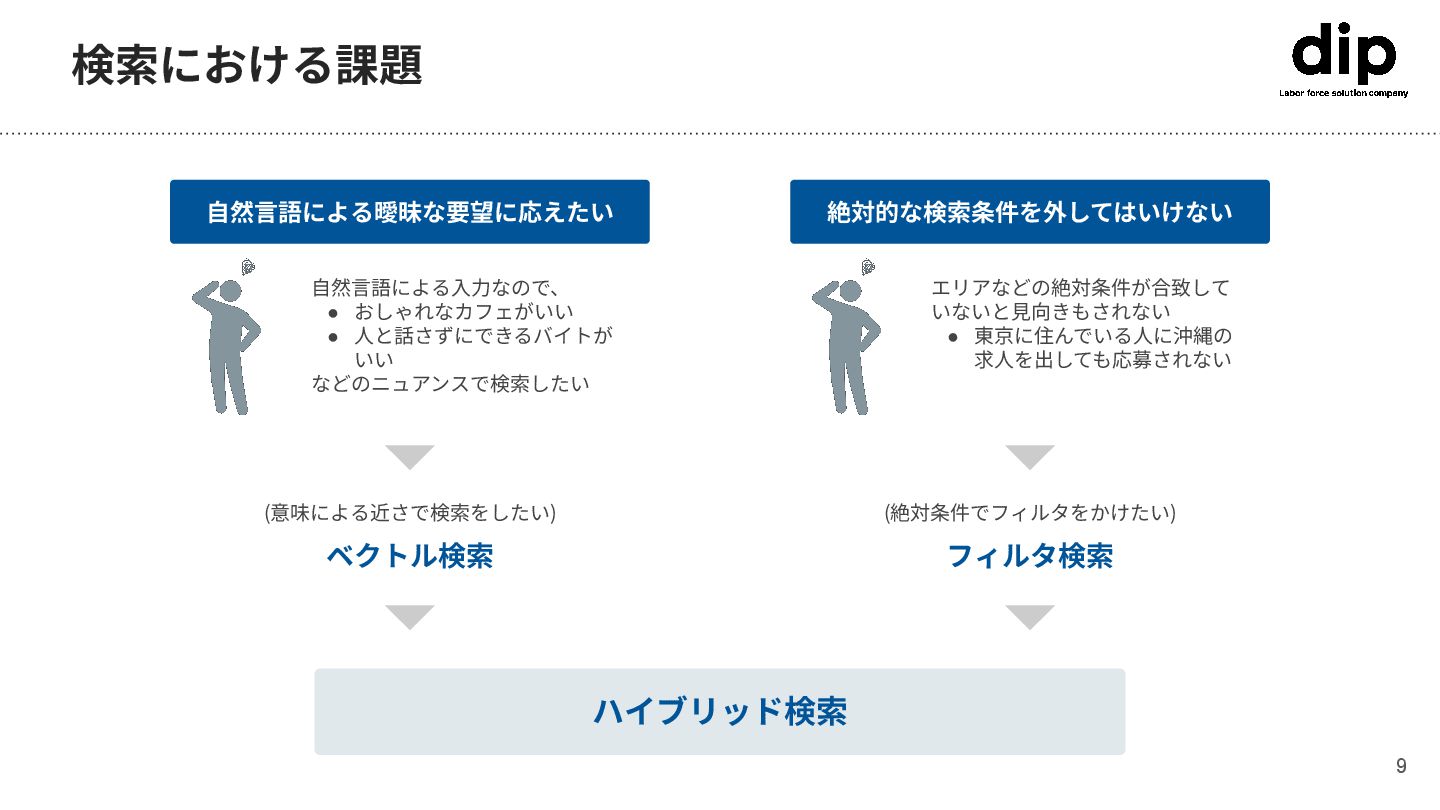 検索における課題 ⾃然⾔語による曖昧な要望に応えたい 絶対的な検索条件を外してはいけない ⾃然⾔語による⼊⼒なので、 • おしゃれなカフェがいい • ⼈と話さずにできるバイトが いい などのニュアンスで検索したい