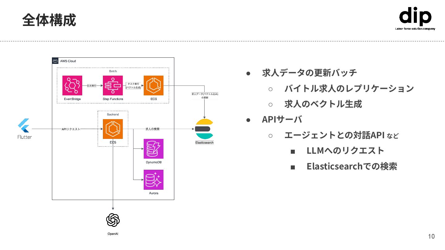 • 求⼈データの更新バッチ ◦ バイトル求⼈のレプリケーション ◦ 求⼈のベクトル⽣成 • APIサーバ ◦ エージェントとの対話API