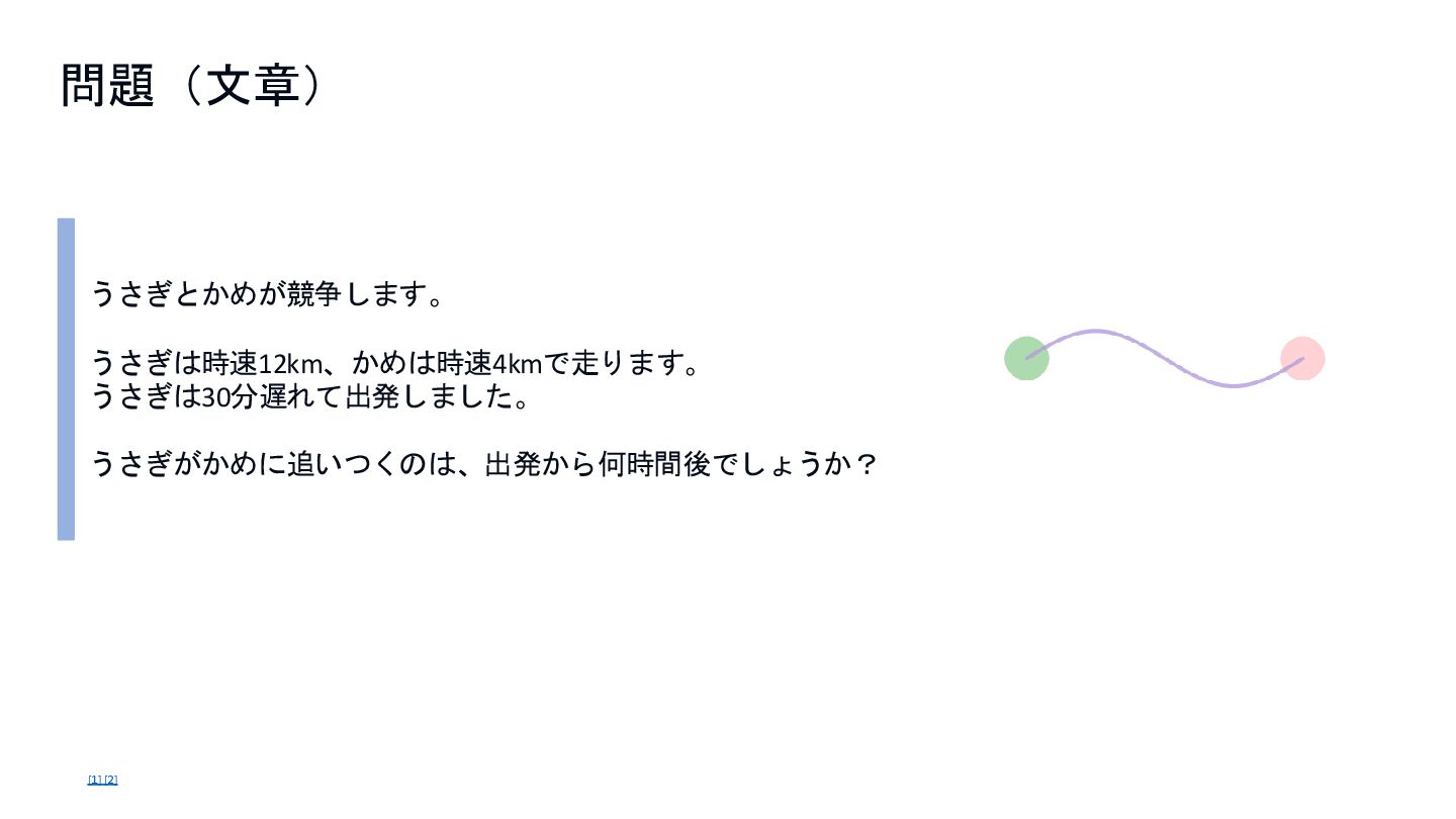 問題(文章) うさぎとかめが競争します。 うさぎは時速12km、かめは時速4kmで走ります。 うさぎは30分遅れて出発しました。 うさぎがかめに追いつくのは、出発から何時間後でしょうか? [1] [2]
