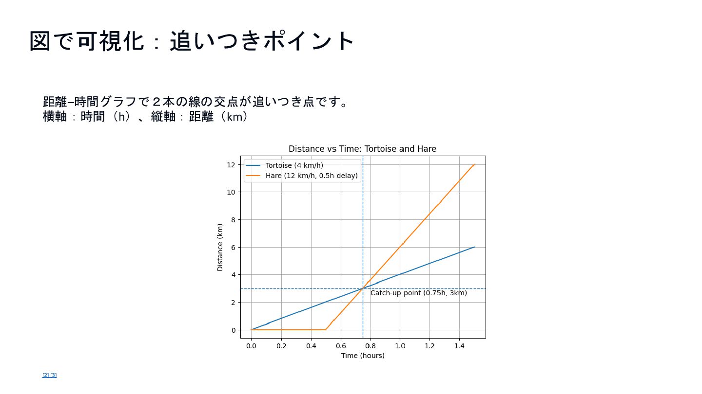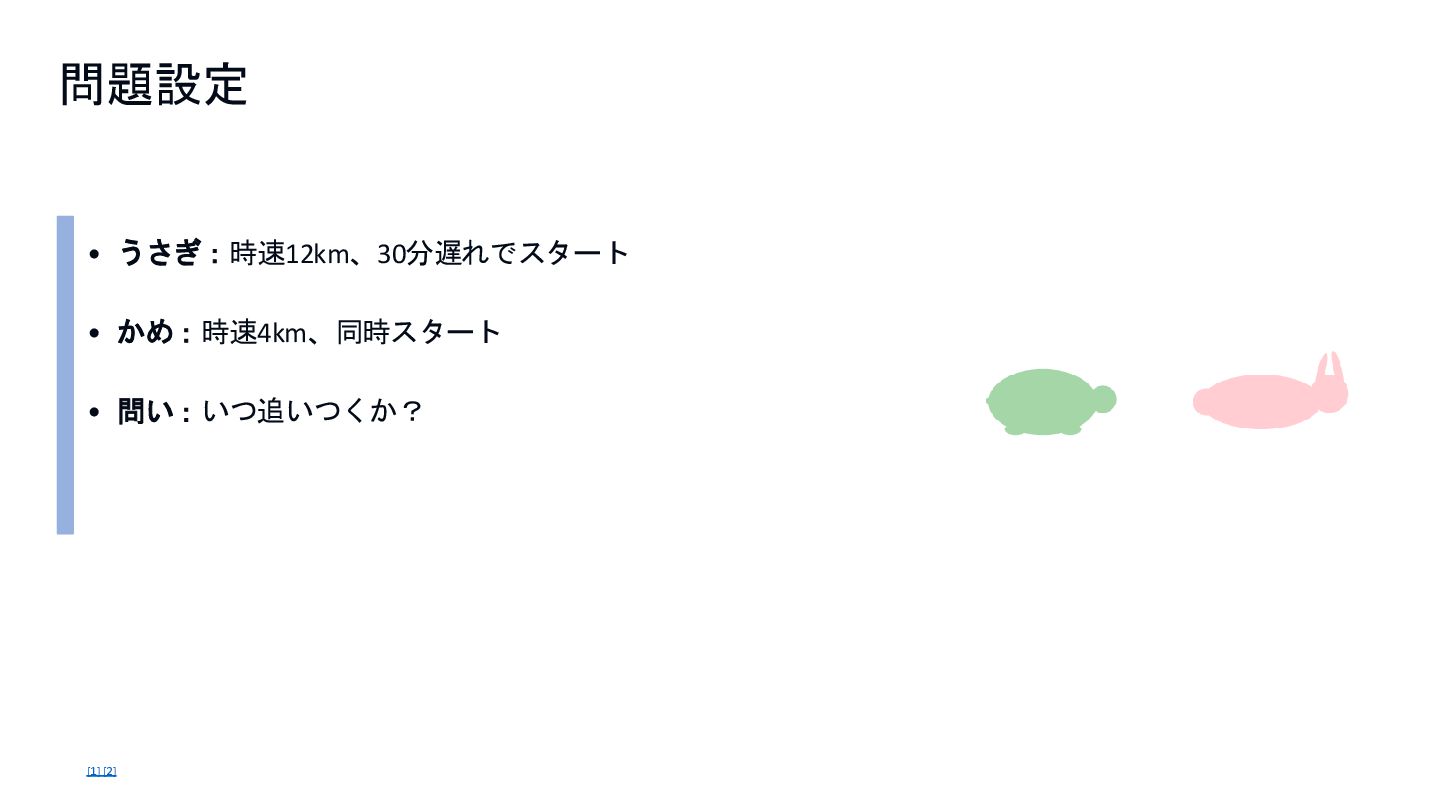 問題設定 • うさぎ:時速12km、30分遅れでスタート • かめ:時速4km、同時スタート • 問い:いつ追いつくか? [1] [2]