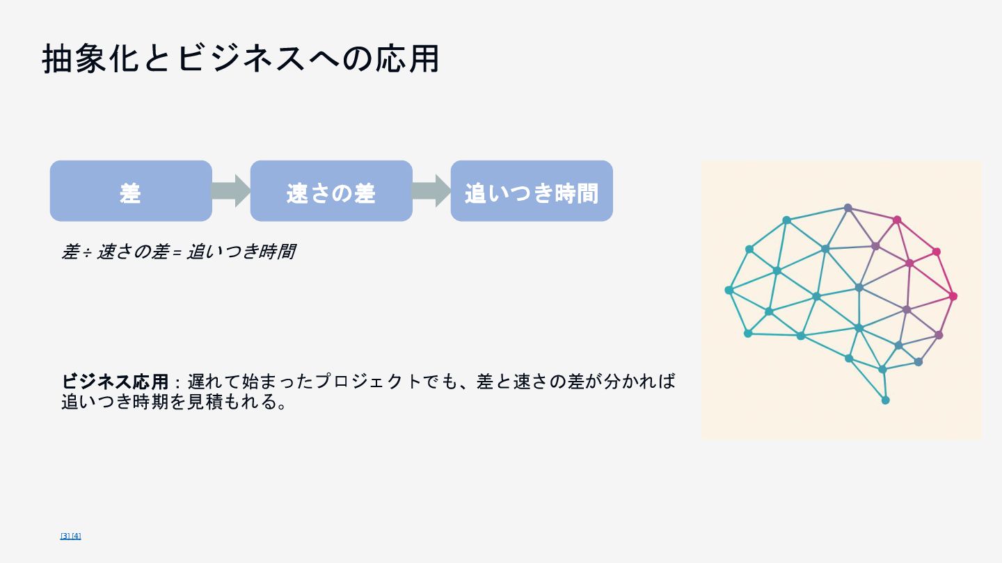 抽象化とビジネスへの応用 差 速さの差 追いつき時間 差 ÷ 速さの差 = 追いつき時間 ビジネス応用:遅れて始まったプロジェクトでも、差と速さの差が分かれば