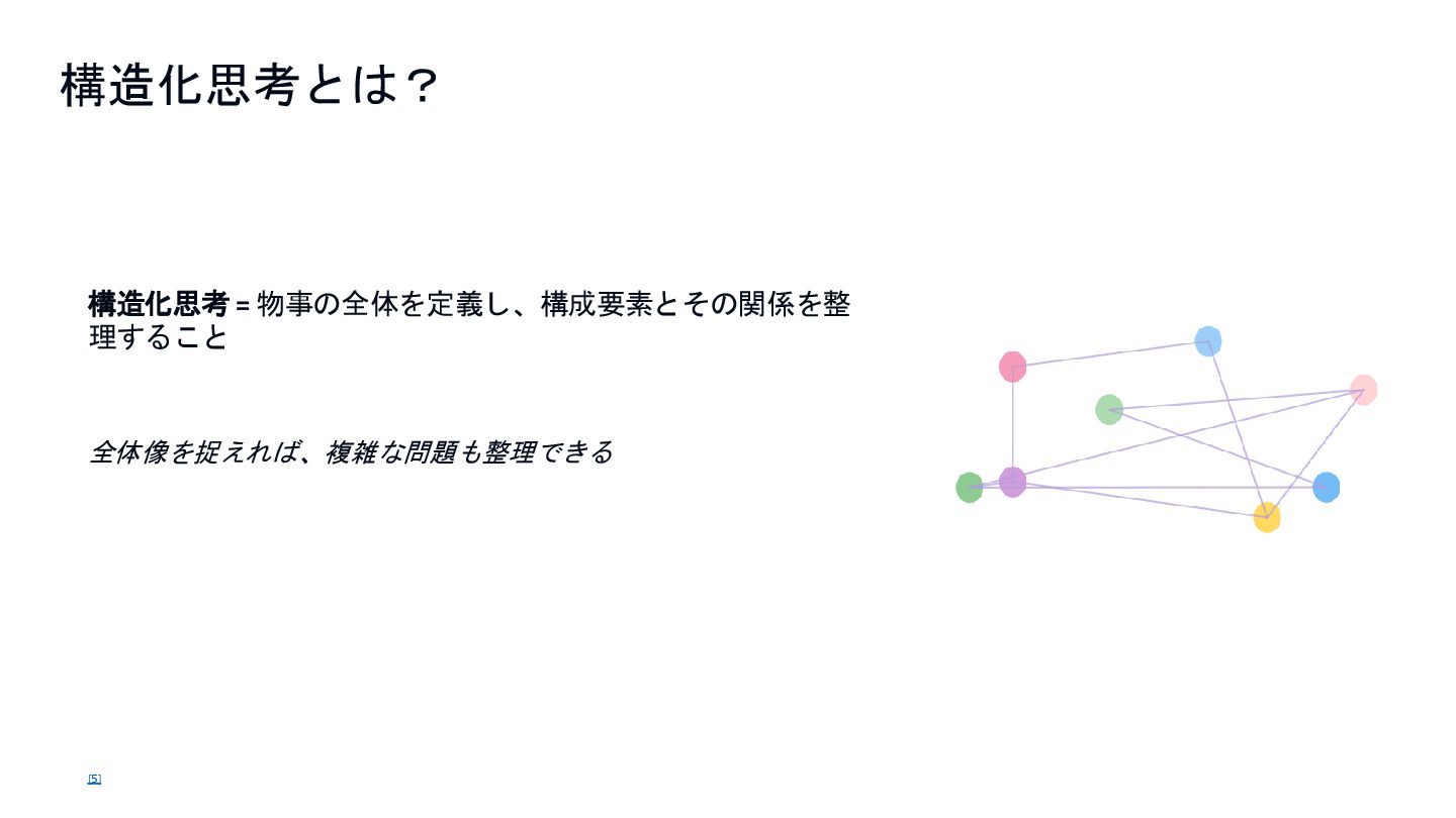 構造化思考とは? 構造化思考 = 物事の全体を定義し、構成要素とその関係を整 理すること 全体像を捉えれば、複雑な問題も整理できる [5]