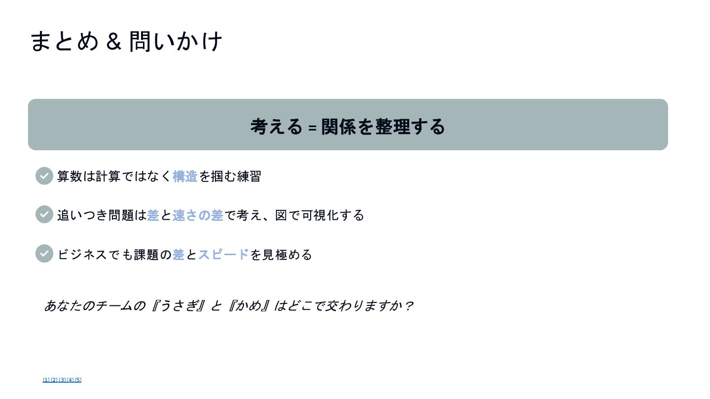 まとめ & 問いかけ 考える = 関係を整理する 算数は計算ではなく構造を掴む練習 追いつき問題は差と速さの差で考え、図で可視化する ビジネスでも課題の差とスピードを見極める あなたのチームの『うさぎ』と『かめ』はどこで交わりますか?