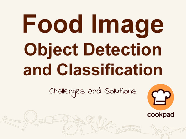 AIチャレンジコンテスト • https://deepanalytics.jp/compe/31 • 先端的な人工知能技術開発を競う場 • 料理画像の画像認識アルゴリズムの作成 ILSVRCにもある物体検出と分類の2タスク クックパッドは料理画像データを提供 •