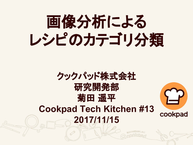 粒度が揃っていない ◦ MECEでない 以下の手順で対象カテゴリを構築 1. メタデータとして使えるカテゴリを取得 → クックパッドのレシピなら1,000くらいのカテゴリ数 2. 視覚的でないものや数が少なすぎるものを除外 → 「大皿・メイン料理」や数十しか画像がないもの 3. サービスにおいて有用そうなものを人力で抽出 4. 分類器での予測精度に基いた類似度でカテゴリを統合 → モデルにとって似ているものはまとめて取り扱いたい → 特徴量平均の距離などに基づくカテゴリ類似度はイマイチ → モデルの誤認識数をベースに類似度を定めたものが有用