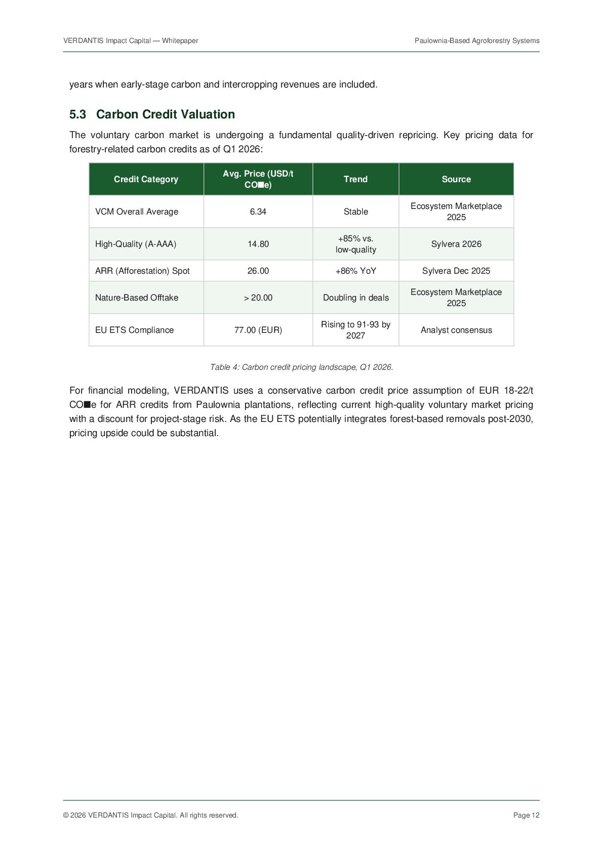 VERDANTIS Impact Capital. All rights reserved. Page 12 years when early-stage carbon and intercropping revenues are included. 5.3 Carbon Credit Valuation The voluntary carbon market is undergoing a fundamental quality-driven repricing. Key pricing data for forestry-related carbon credits as of Q1 2026: Credit Category Avg. Price (USD/t COse) Trend Source VCM Overall Average 6.34 Stable Ecosystem Marketplace 2025 High-Quality (A-AAA) 14.80 +85% vs. low-quality Sylvera 2026 ARR (Afforestation) Spot 26.00 +86% YoY Sylvera Dec 2025 Nature-Based Offtake > 20.00 Doubling in deals Ecosystem Marketplace 2025 EU ETS Compliance 77.00 (EUR) Rising to 91-93 by 2027 Analyst consensus Table 4: Carbon credit pricing landscape, Q1 2026. For financial modeling, VERDANTIS uses a conservative carbon credit price assumption of EUR 18-22/t COse for ARR credits from Paulownia plantations, reflecting current high-quality voluntary market pricing with a discount for project-stage risk. As the EU ETS potentially integrates forest-based removals post-2030, pricing upside could be substantial.