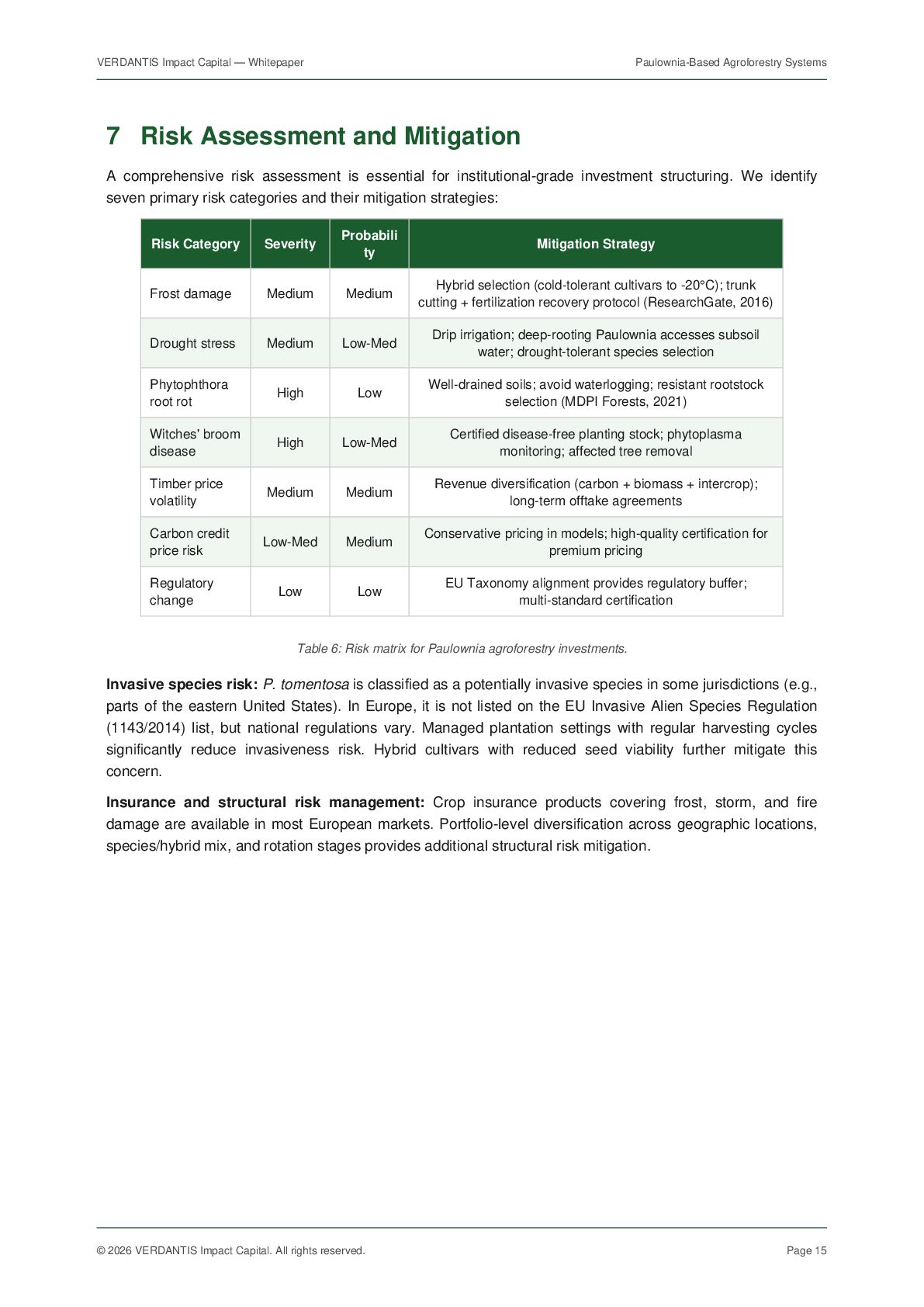 VERDANTIS Impact Capital. All rights reserved. Page 15 7 Risk Assessment and Mitigation A comprehensive risk assessment is essential for institutional-grade investment structuring. We identify seven primary risk categories and their mitigation strategies: Risk Category Severity Probabili ty Mitigation Strategy Frost damage Medium Medium Hybrid selection (cold-tolerant cultivars to -20°C); trunk cutting + fertilization recovery protocol (ResearchGate, 2016) Drought stress Medium Low-Med Drip irrigation; deep-rooting Paulownia accesses subsoil water; drought-tolerant species selection Phytophthora root rot High Low Well-drained soils; avoid waterlogging; resistant rootstock selection (MDPI Forests, 2021) Witches' broom disease High Low-Med Certified disease-free planting stock; phytoplasma monitoring; affected tree removal Timber price volatility Medium Medium Revenue diversification (carbon + biomass + intercrop); long-term offtake agreements Carbon credit price risk Low-Med Medium Conservative pricing in models; high-quality certification for premium pricing Regulatory change Low Low EU Taxonomy alignment provides regulatory buffer; multi-standard certification Table 6: Risk matrix for Paulownia agroforestry investments. Invasive species risk: P. tomentosa is classified as a potentially invasive species in some jurisdictions (e.g., parts of the eastern United States). In Europe, it is not listed on the EU Invasive Alien Species Regulation (1143/2014) list, but national regulations vary. Managed plantation settings with regular harvesting cycles significantly reduce invasiveness risk. Hybrid cultivars with reduced seed viability further mitigate this concern. Insurance and structural risk management: Crop insurance products covering frost, storm, and fire damage are available in most European markets. Portfolio-level diversification across geographic locations, species/hybrid mix, and rotation stages provides additional structural risk mitigation.