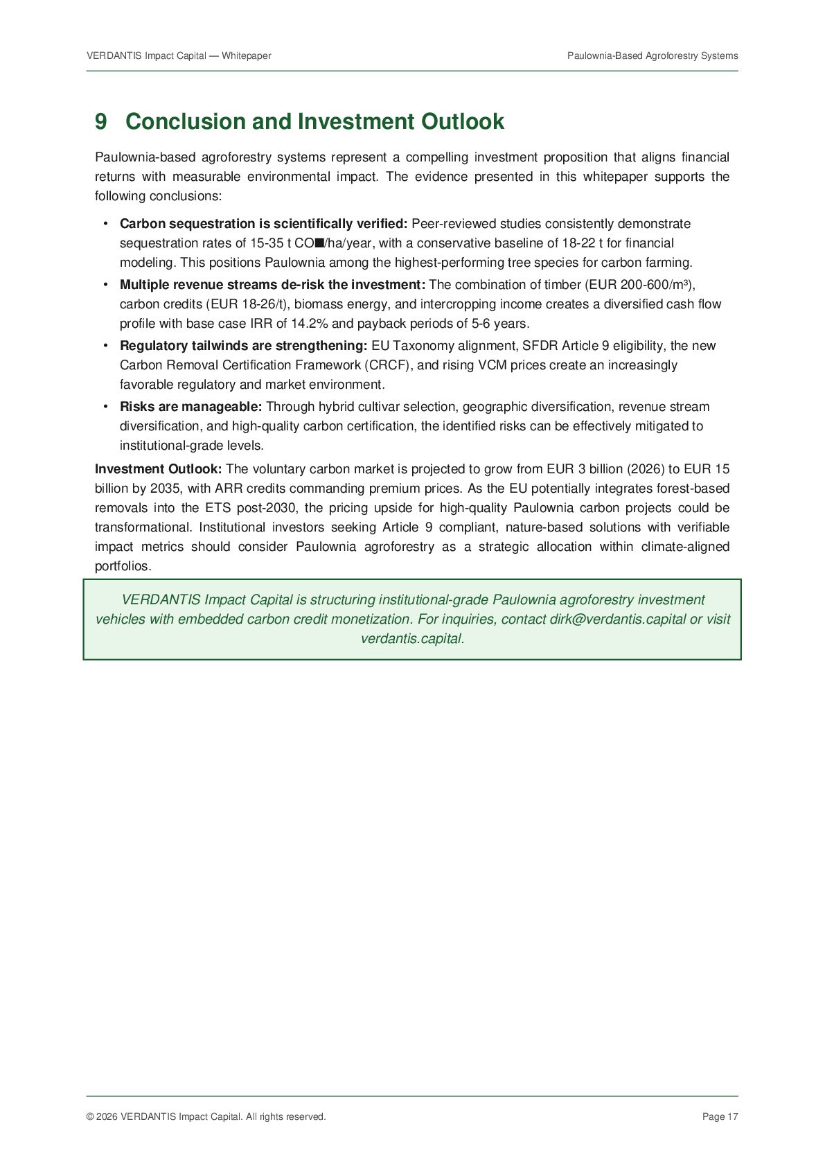 VERDANTIS Impact Capital. All rights reserved. Page 17 9 Conclusion and Investment Outlook Paulownia-based agroforestry systems represent a compelling investment proposition that aligns financial returns with measurable environmental impact. The evidence presented in this whitepaper supports the following conclusions: • Carbon sequestration is scientifically verified: Peer-reviewed studies consistently demonstrate sequestration rates of 15-35 t COs/ha/year, with a conservative baseline of 18-22 t for financial modeling. This positions Paulownia among the highest-performing tree species for carbon farming. • Multiple revenue streams de-risk the investment: The combination of timber (EUR 200-600/m³), carbon credits (EUR 18-26/t), biomass energy, and intercropping income creates a diversified cash flow profile with base case IRR of 14.2% and payback periods of 5-6 years. • Regulatory tailwinds are strengthening: EU Taxonomy alignment, SFDR Article 9 eligibility, the new Carbon Removal Certification Framework (CRCF), and rising VCM prices create an increasingly favorable regulatory and market environment. • Risks are manageable: Through hybrid cultivar selection, geographic diversification, revenue stream diversification, and high-quality carbon certification, the identified risks can be effectively mitigated to institutional-grade levels. Investment Outlook: The voluntary carbon market is projected to grow from EUR 3 billion (2026) to EUR 15 billion by 2035, with ARR credits commanding premium prices. As the EU potentially integrates forest-based removals into the ETS post-2030, the pricing upside for high-quality Paulownia carbon projects could be transformational. Institutional investors seeking Article 9 compliant, nature-based solutions with verifiable impact metrics should consider Paulownia agroforestry as a strategic allocation within climate-aligned portfolios. VERDANTIS Impact Capital is structuring institutional-grade Paulownia agroforestry investment vehicles with embedded carbon credit monetization. For inquiries, contact [email protected] or visit verdantis.capital.
