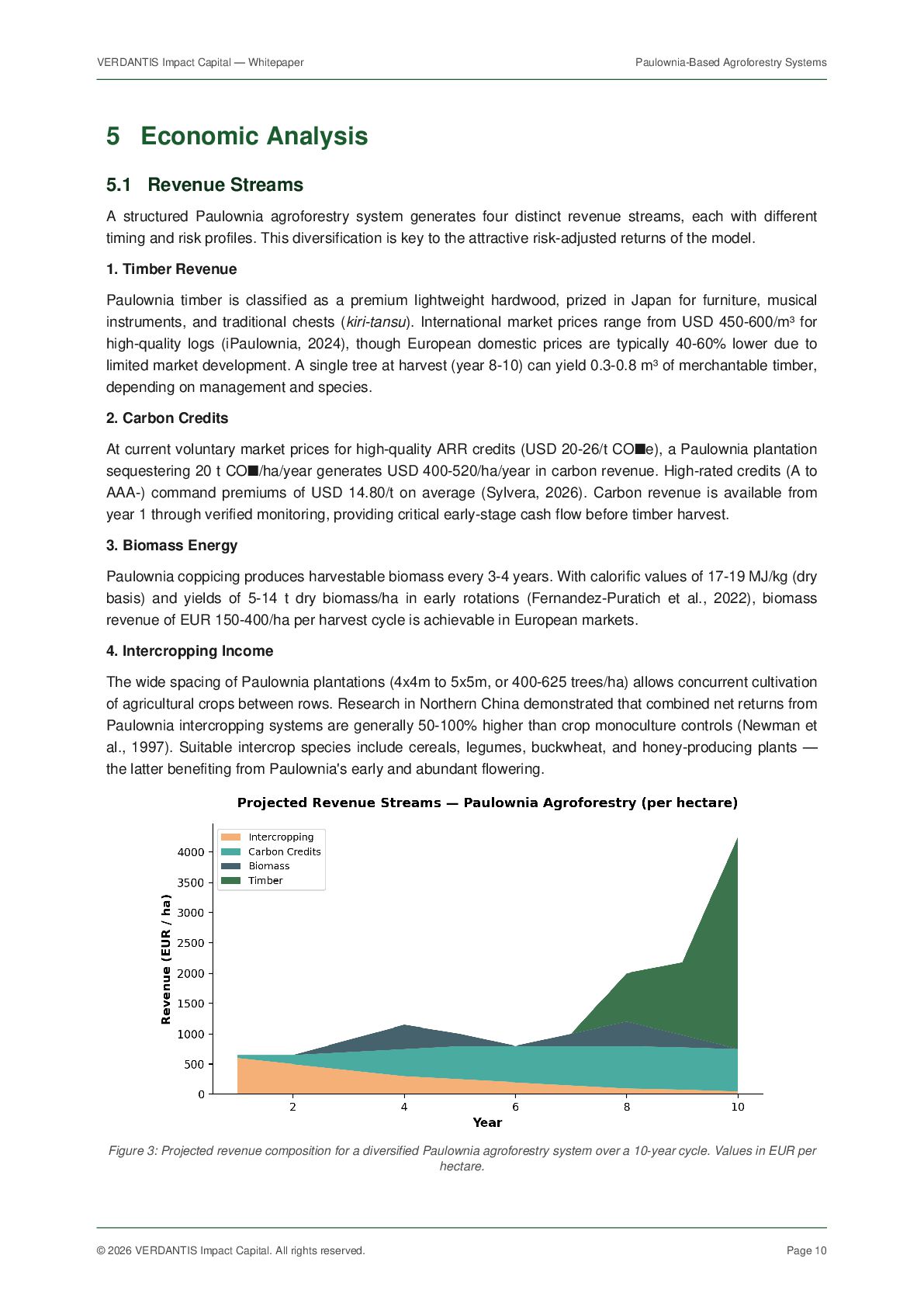 VERDANTIS Impact Capital. All rights reserved. Page 10 5 Economic Analysis 5.1 Revenue Streams A structured Paulownia agroforestry system generates four distinct revenue streams, each with different timing and risk profiles. This diversification is key to the attractive risk-adjusted returns of the model. 1. Timber Revenue Paulownia timber is classified as a premium lightweight hardwood, prized in Japan for furniture, musical instruments, and traditional chests (kiri-tansu). International market prices range from USD 450-600/m³ for high-quality logs (iPaulownia, 2024), though European domestic prices are typically 40-60% lower due to limited market development. A single tree at harvest (year 8-10) can yield 0.3-0.8 m³ of merchantable timber, depending on management and species. 2. Carbon Credits At current voluntary market prices for high-quality ARR credits (USD 20-26/t COse), a Paulownia plantation sequestering 20 t COs/ha/year generates USD 400-520/ha/year in carbon revenue. High-rated credits (A to AAA-) command premiums of USD 14.80/t on average (Sylvera, 2026). Carbon revenue is available from year 1 through verified monitoring, providing critical early-stage cash flow before timber harvest. 3. Biomass Energy Paulownia coppicing produces harvestable biomass every 3-4 years. With calorific values of 17-19 MJ/kg (dry basis) and yields of 5-14 t dry biomass/ha in early rotations (Fernandez-Puratich et al., 2022), biomass revenue of EUR 150-400/ha per harvest cycle is achievable in European markets. 4. Intercropping Income The wide spacing of Paulownia plantations (4x4m to 5x5m, or 400-625 trees/ha) allows concurrent cultivation of agricultural crops between rows. Research in Northern China demonstrated that combined net returns from Paulownia intercropping systems are generally 50-100% higher than crop monoculture controls (Newman et al., 1997). Suitable intercrop species include cereals, legumes, buckwheat, and honey-producing plants — the latter benefiting from Paulownia's early and abundant flowering. Figure 3: Projected revenue composition for a diversified Paulownia agroforestry system over a 10-year cycle. Values in EUR per hectare.