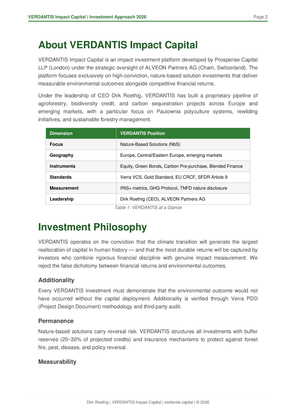 Roethig | VERDANTIS Impact Capital | verdantis.capital | © 2026 About VERDANTIS Impact Capital VERDANTIS Impact Capital is an impact investment platform developed by Prosperise Capital LLP (London) under the strategic oversight of ALVEON Partners AG (Cham, Switzerland). The platform focuses exclusively on high-conviction, nature-based solution investments that deliver measurable environmental outcomes alongside competitive financial returns. Under the leadership of CEO Dirk Roethig, VERDANTIS has built a proprietary pipeline of agroforestry, biodiversity credit, and carbon sequestration projects across Europe and emerging markets, with a particular focus on Paulownia polyculture systems, rewilding initiatives, and sustainable forestry management. Dimension VERDANTIS Position Focus Nature-Based Solutions (NbS) Geography Europe, Central/Eastern Europe, emerging markets Instruments Equity, Green Bonds, Carbon Pre-purchase, Blended Finance Standards Verra VCS, Gold Standard, EU CRCF, SFDR Article 9 Measurement IRIS+ metrics, GHG Protocol, TNFD nature disclosure Leadership Dirk Roethig (CEO), ALVEON Partners AG Table 1: VERDANTIS at a Glance Investment Philosophy VERDANTIS operates on the conviction that the climate transition will generate the largest reallocation of capital in human history — and that the most durable returns will be captured by investors who combine rigorous financial discipline with genuine impact measurement. We reject the false dichotomy between financial returns and environmental outcomes. Additionality Every VERDANTIS investment must demonstrate that the environmental outcome would not have occurred without the capital deployment. Additionality is verified through Verra PDD (Project Design Document) methodology and third-party audit. Permanence Nature-based solutions carry reversal risk. VERDANTIS structures all investments with buffer reserves (20–30% of projected credits) and insurance mechanisms to protect against forest fire, pest, disease, and policy reversal. Measurability