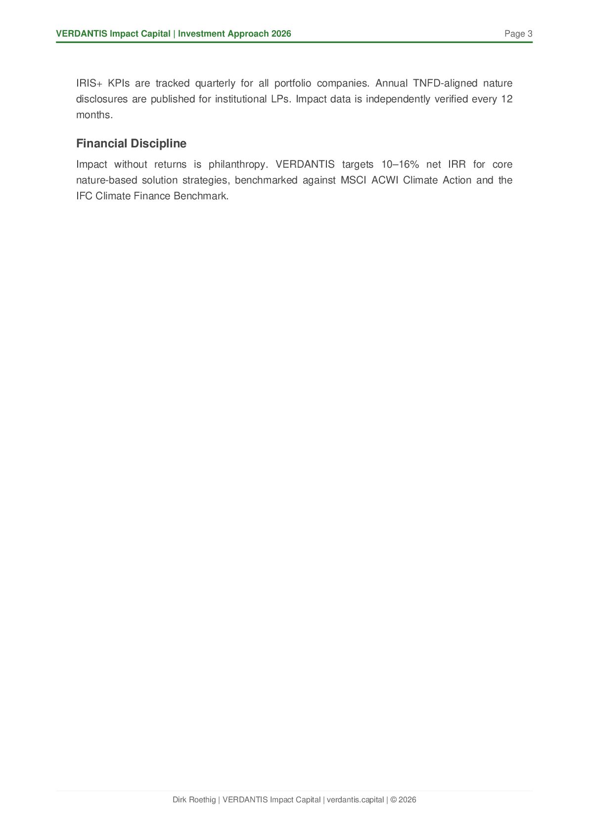 Roethig | VERDANTIS Impact Capital | verdantis.capital | © 2026 IRIS+ KPIs are tracked quarterly for all portfolio companies. Annual TNFD-aligned nature disclosures are published for institutional LPs. Impact data is independently verified every 12 months. Financial Discipline Impact without returns is philanthropy. VERDANTIS targets 10–16% net IRR for core nature-based solution strategies, benchmarked against MSCI ACWI Climate Action and the IFC Climate Finance Benchmark.