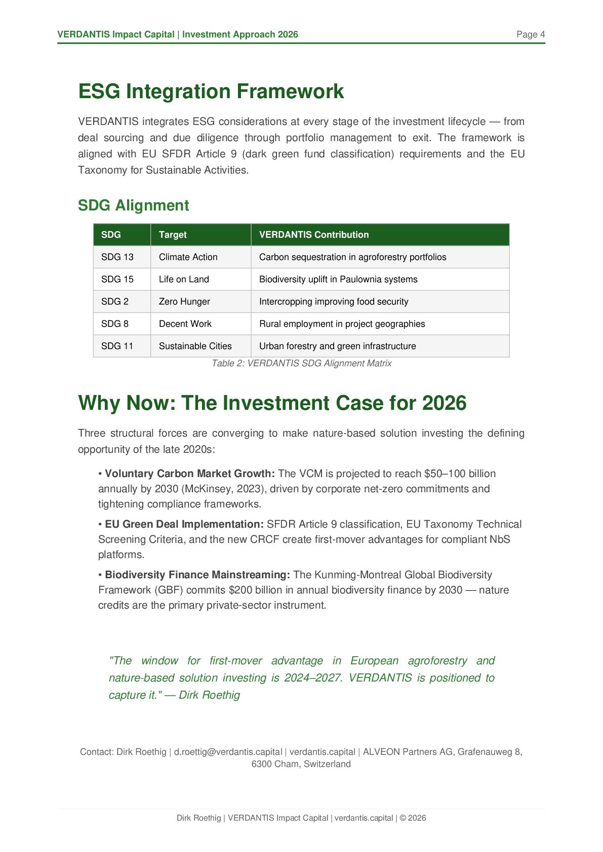 Roethig | VERDANTIS Impact Capital | verdantis.capital | © 2026 ESG Integration Framework VERDANTIS integrates ESG considerations at every stage of the investment lifecycle — from deal sourcing and due diligence through portfolio management to exit. The framework is aligned with EU SFDR Article 9 (dark green fund classification) requirements and the EU Taxonomy for Sustainable Activities. SDG Alignment SDG Target VERDANTIS Contribution SDG 13 Climate Action Carbon sequestration in agroforestry portfolios SDG 15 Life on Land Biodiversity uplift in Paulownia systems SDG 2 Zero Hunger Intercropping improving food security SDG 8 Decent Work Rural employment in project geographies SDG 11 Sustainable Cities Urban forestry and green infrastructure Table 2: VERDANTIS SDG Alignment Matrix Why Now: The Investment Case for 2026 Three structural forces are converging to make nature-based solution investing the defining opportunity of the late 2020s: • Voluntary Carbon Market Growth: The VCM is projected to reach $50–100 billion annually by 2030 (McKinsey, 2023), driven by corporate net-zero commitments and tightening compliance frameworks. • EU Green Deal Implementation: SFDR Article 9 classification, EU Taxonomy Technical Screening Criteria, and the new CRCF create first-mover advantages for compliant NbS platforms. • Biodiversity Finance Mainstreaming: The Kunming-Montreal Global Biodiversity Framework (GBF) commits $200 billion in annual biodiversity finance by 2030 — nature credits are the primary private-sector instrument. "The window for first-mover advantage in European agroforestry and nature-based solution investing is 2024–2027. VERDANTIS is positioned to capture it." — Dirk Roethig Contact: Dirk Roethig | [email protected] | verdantis.capital | ALVEON Partners AG, Grafenauweg 8, 6300 Cham, Switzerland