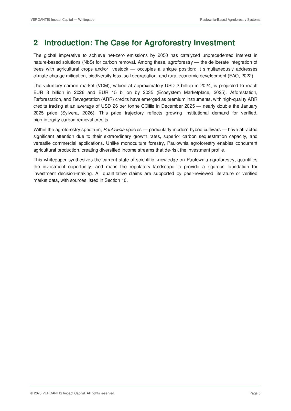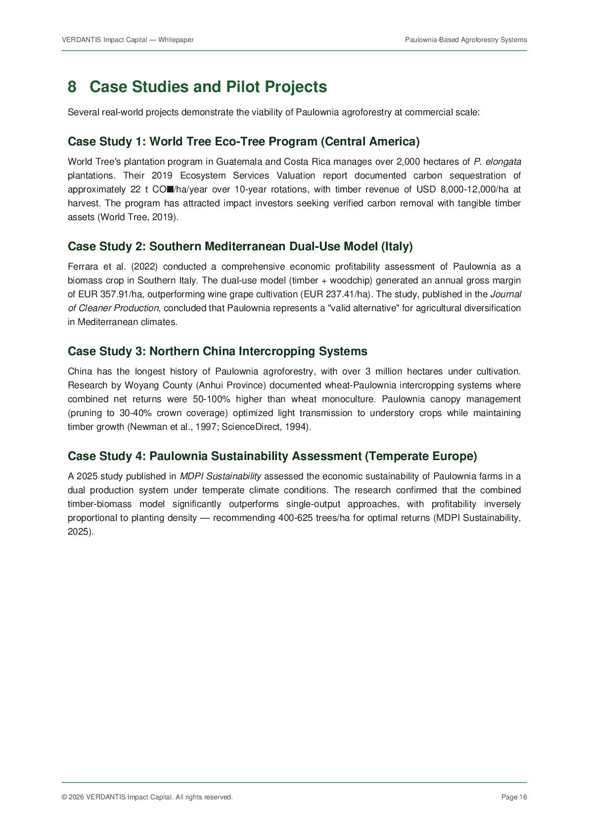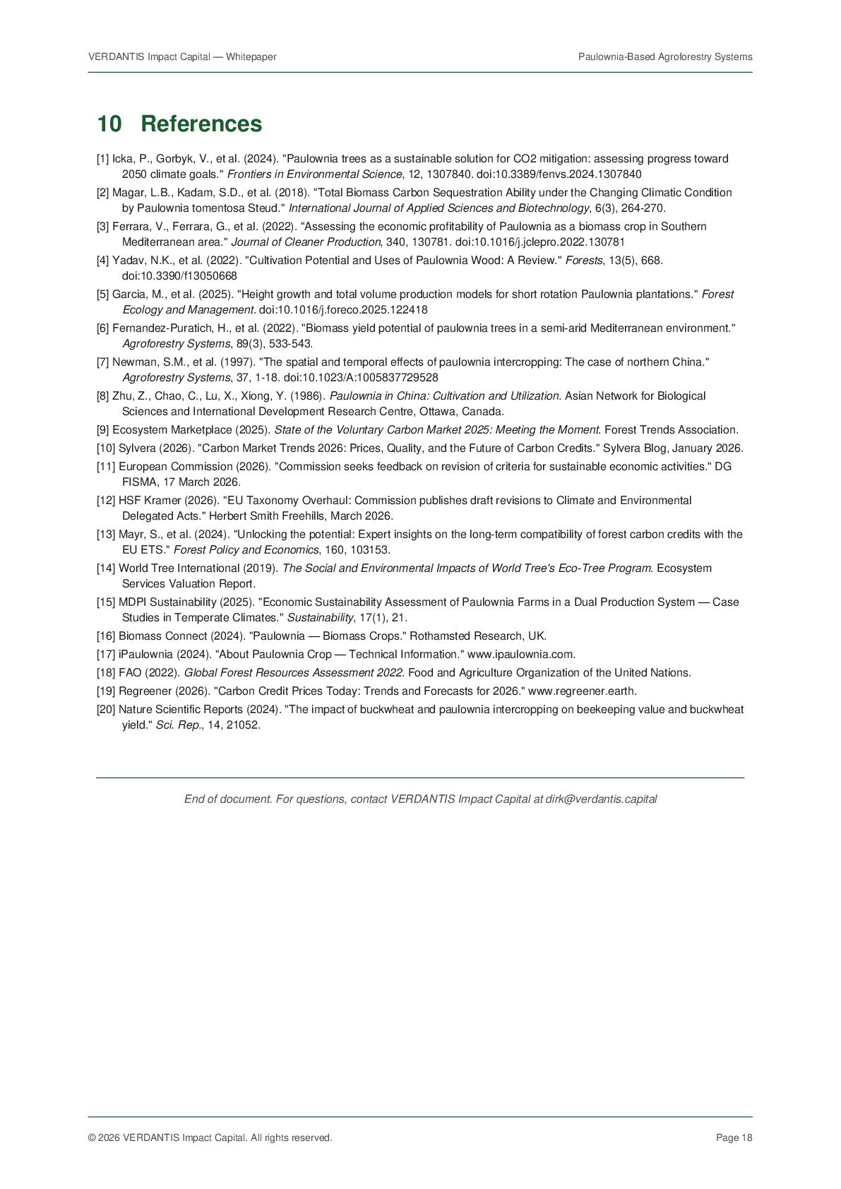 VERDANTIS Impact Capital. All rights reserved. Page 18 10 References [1] Icka, P., Gorbyk, V., et al. (2024). "Paulownia trees as a sustainable solution for CO2 mitigation: assessing progress toward 2050 climate goals." Frontiers in Environmental Science, 12, 1307840. doi:10.3389/fenvs.2024.1307840 [2] Magar, L.B., Kadam, S.D., et al. (2018). "Total Biomass Carbon Sequestration Ability under the Changing Climatic Condition by Paulownia tomentosa Steud." International Journal of Applied Sciences and Biotechnology, 6(3), 264-270. [3] Ferrara, V., Ferrara, G., et al. (2022). "Assessing the economic profitability of Paulownia as a biomass crop in Southern Mediterranean area." Journal of Cleaner Production, 340, 130781. doi:10.1016/j.jclepro.2022.130781 [4] Yadav, N.K., et al. (2022). "Cultivation Potential and Uses of Paulownia Wood: A Review." Forests, 13(5), 668. doi:10.3390/f13050668 [5] Garcia, M., et al. (2025). "Height growth and total volume production models for short rotation Paulownia plantations." Forest Ecology and Management. doi:10.1016/j.foreco.2025.122418 [6] Fernandez-Puratich, H., et al. (2022). "Biomass yield potential of paulownia trees in a semi-arid Mediterranean environment." Agroforestry Systems, 89(3), 533-543. [7] Newman, S.M., et al. (1997). "The spatial and temporal effects of paulownia intercropping: The case of northern China." Agroforestry Systems, 37, 1-18. doi:10.1023/A:1005837729528 [8] Zhu, Z., Chao, C., Lu, X., Xiong, Y. (1986). Paulownia in China: Cultivation and Utilization. Asian Network for Biological Sciences and International Development Research Centre, Ottawa, Canada. [9] Ecosystem Marketplace (2025). State of the Voluntary Carbon Market 2025: Meeting the Moment. Forest Trends Association. [10] Sylvera (2026). "Carbon Market Trends 2026: Prices, Quality, and the Future of Carbon Credits." Sylvera Blog, January 2026. [11] European Commission (2026). "Commission seeks feedback on revision of criteria for sustainable economic activities." DG FISMA, 17 March 2026. [12] HSF Kramer (2026). "EU Taxonomy Overhaul: Commission publishes draft revisions to Climate and Environmental Delegated Acts." Herbert Smith Freehills, March 2026. [13] Mayr, S., et al. (2024). "Unlocking the potential: Expert insights on the long-term compatibility of forest carbon credits with the EU ETS." Forest Policy and Economics, 160, 103153. [14] World Tree International (2019). The Social and Environmental Impacts of World Tree's Eco-Tree Program. Ecosystem Services Valuation Report. [15] MDPI Sustainability (2025). "Economic Sustainability Assessment of Paulownia Farms in a Dual Production System — Case Studies in Temperate Climates." Sustainability, 17(1), 21. [16] Biomass Connect (2024). "Paulownia — Biomass Crops." Rothamsted Research, UK. [17] iPaulownia (2024). "About Paulownia Crop — Technical Information." www.ipaulownia.com. [18] FAO (2022). Global Forest Resources Assessment 2022. Food and Agriculture Organization of the United Nations. [19] Regreener (2026). "Carbon Credit Prices Today: Trends and Forecasts for 2026." www.regreener.earth. [20] Nature Scientific Reports (2024). "The impact of buckwheat and paulownia intercropping on beekeeping value and buckwheat yield." Sci. Rep., 14, 21052. End of document. For questions, contact VERDANTIS Impact Capital at