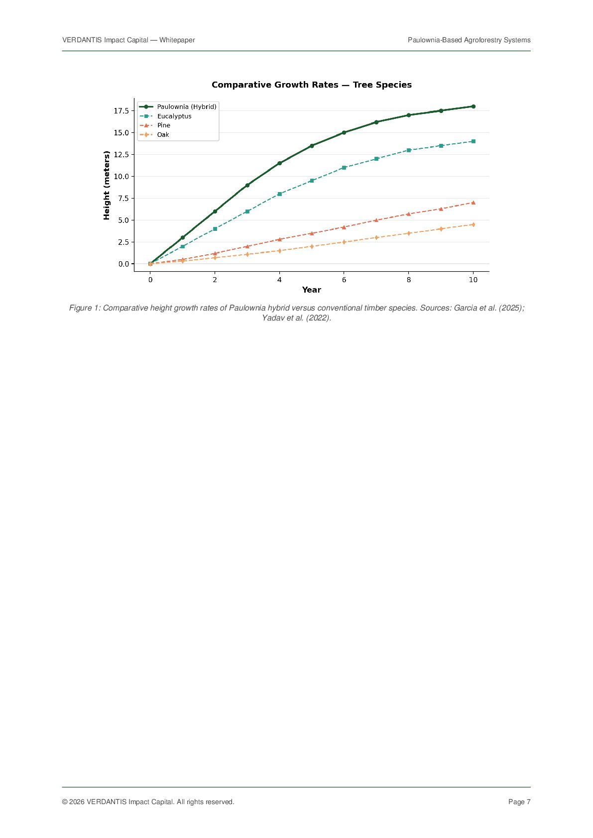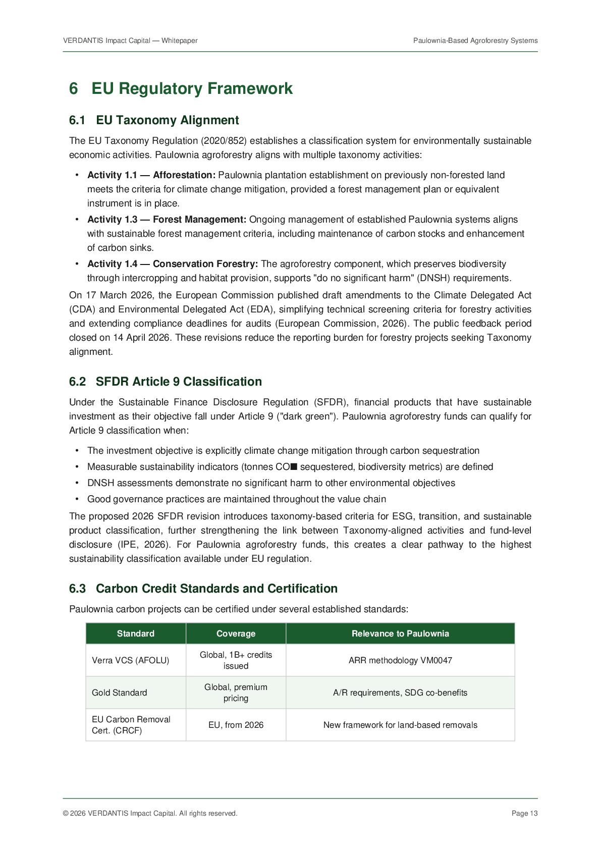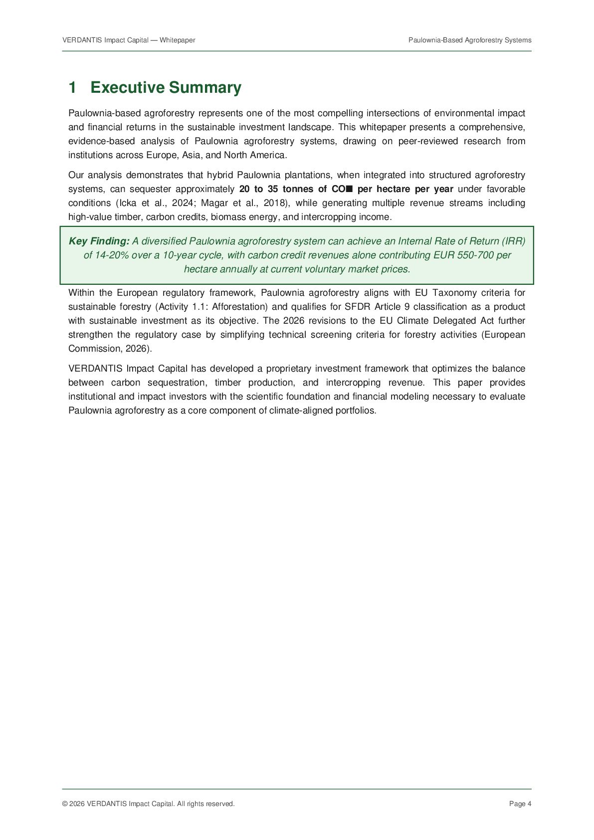 VERDANTIS Impact Capital. All rights reserved. Page 18 10 References [1] Icka, P., Gorbyk, V., et al. (2024). "Paulownia trees as a sustainable solution for CO2 mitigation: assessing progress toward 2050 climate goals." Frontiers in Environmental Science, 12, 1307840. doi:10.3389/fenvs.2024.1307840 [2] Magar, L.B., Kadam, S.D., et al. (2018). "Total Biomass Carbon Sequestration Ability under the Changing Climatic Condition by Paulownia tomentosa Steud." International Journal of Applied Sciences and Biotechnology, 6(3), 264-270. [3] Ferrara, V., Ferrara, G., et al. (2022). "Assessing the economic profitability of Paulownia as a biomass crop in Southern Mediterranean area." Journal of Cleaner Production, 340, 130781. doi:10.1016/j.jclepro.2022.130781 [4] Yadav, N.K., et al. (2022). "Cultivation Potential and Uses of Paulownia Wood: A Review." Forests, 13(5), 668. doi:10.3390/f13050668 [5] Garcia, M., et al. (2025). "Height growth and total volume production models for short rotation Paulownia plantations." Forest Ecology and Management. doi:10.1016/j.foreco.2025.122418 [6] Fernandez-Puratich, H., et al. (2022). "Biomass yield potential of paulownia trees in a semi-arid Mediterranean environment." Agroforestry Systems, 89(3), 533-543. [7] Newman, S.M., et al. (1997). "The spatial and temporal effects of paulownia intercropping: The case of northern China." Agroforestry Systems, 37, 1-18. doi:10.1023/A:1005837729528 [8] Zhu, Z., Chao, C., Lu, X., Xiong, Y. (1986). Paulownia in China: Cultivation and Utilization. Asian Network for Biological Sciences and International Development Research Centre, Ottawa, Canada. [9] Ecosystem Marketplace (2025). State of the Voluntary Carbon Market 2025: Meeting the Moment. Forest Trends Association. [10] Sylvera (2026). "Carbon Market Trends 2026: Prices, Quality, and the Future of Carbon Credits." Sylvera Blog, January 2026. [11] European Commission (2026). "Commission seeks feedback on revision of criteria for sustainable economic activities." DG FISMA, 17 March 2026. [12] HSF Kramer (2026). "EU Taxonomy Overhaul: Commission publishes draft revisions to Climate and Environmental Delegated Acts." Herbert Smith Freehills, March 2026. [13] Mayr, S., et al. (2024). "Unlocking the potential: Expert insights on the long-term compatibility of forest carbon credits with the EU ETS." Forest Policy and Economics, 160, 103153. [14] World Tree International (2019). The Social and Environmental Impacts of World Tree's Eco-Tree Program. Ecosystem Services Valuation Report. [15] MDPI Sustainability (2025). "Economic Sustainability Assessment of Paulownia Farms in a Dual Production System — Case Studies in Temperate Climates." Sustainability, 17(1), 21. [16] Biomass Connect (2024). "Paulownia — Biomass Crops." Rothamsted Research, UK. [17] iPaulownia (2024). "About Paulownia Crop — Technical Information." www.ipaulownia.com. [18] FAO (2022). Global Forest Resources Assessment 2022. Food and Agriculture Organization of the United Nations. [19] Regreener (2026). "Carbon Credit Prices Today: Trends and Forecasts for 2026." www.regreener.earth. [20] Nature Scientific Reports (2024). "The impact of buckwheat and paulownia intercropping on beekeeping value and buckwheat yield." Sci. Rep., 14, 21052. End of document. For questions, contact VERDANTIS Impact Capital at