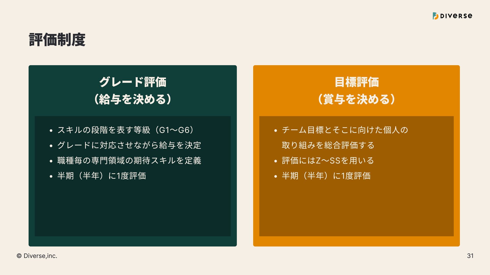 ü É U ¡ f ™ z † ‰ スキルの段階を表す等級(G1〜G6) グレードに対応させながら給与を決定 職種毎の専門領域の期待スキルを定義 半期(半年)に1度評 î ˇ U ¡ Þ ™ z † ‰ チーム目標とそこに向けた個人の 取り組みを総合評価する 評価にはZ〜SSを用いる 半期(半年)に1度評