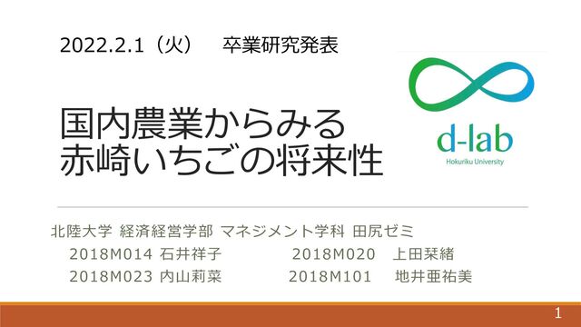 国内農業からみる ⾚崎いちごの将来性 北陸⼤学 経済経営学部 マネジメント学科 ⽥尻ゼミ 2018M014 ⽯井祥⼦ 2018M020 上⽥栞緒