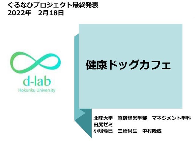 健康ドッグカフェ 参考文献 金沢市ホームページ(閲覧日1月19日) https://www4.city.kanazawa.lg.jp/s/11001/aroundkan azawapotarea/shatorubasu.html https://www4.city.kanazawa.lg.jp/s/11001/aroundkan azawapotarea/kanaiwaono_map.html 齋藤ゆみ、西巻優、辰己尚隆、小野さや香、木下美絵、笹山哲、齋藤邦 明 「木材学会誌