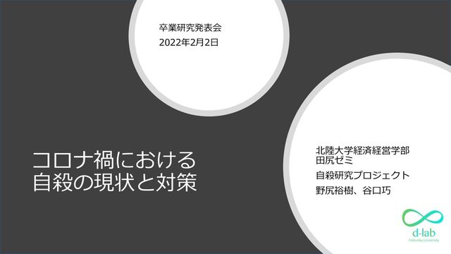 コロナ禍における ⾃殺の現状と対策 卒業研究発表会 2022年2⽉2⽇ 北陸⼤学経済経営学部 ⽥尻ゼミ ⾃殺研究プロジェクト 野尻裕樹、⾕⼝巧