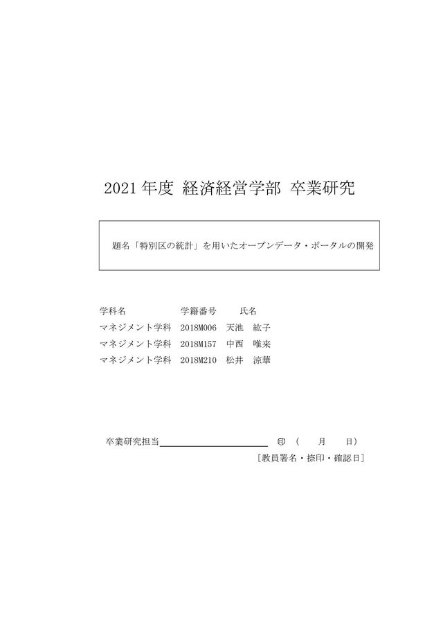 11 月 23 日アクセス) . Our World in Date,https://ourworldindata.org/,(2021 年 11 月 23 日アクセス) . The World Bank,https://www.worldbank.org/en/home,(2021 年 11 月 23 日アクセ ス) . 公益財団法人特別区協議会, 「特別区の統計」 ,https://www.tokyo-23city.or.jp/chosa/toke i/tokubetsuku/index.html,(2021 年 11 月 23 日アクセス) . 庄司昌彦責任編集(2014) 『オープンデータ特集号』 ,国際大学グローバル・コミュニケ ーション・センター. 総務省,2020.12.18,「統計表における機械判読可能なデータ 作成に関する表記方法」,htt ps://www.soumu.go.jp/main_content/000723626.pdf 総務省統計局,「e-Stat 政府統計の総合窓口」,https://www.e-stat.go.jp/,(2021 年 11 月 2 3 日アクセス). 高度情報通信ネットワーク社会推進戦略本部,2021.6.15,「オープンデータ基本指針」, https://cio.go.jp/sites/default/files/uploads/documents/data_shishin.pdf 高度情報通信ネットワーク社会推進戦略本部(IT 総合戦略本部)(2016) 「官民データ活用 推進基本法」 ,https://www.kantei.go.jp/jp/singi/it2/hourei/detakatsuyo_honbun.html https://www.e-stat.go.jp/,(2021 年 11 月 23 日アクセス). 日本銀行,https://www.boj.or.jp/,(2021 年 11 月 23 日アクセス) . 西村清彦・山澤成康・肥後雅博(2020) 『統計 危機と改革 システム劣化からの復活』 , 日経 BP. 日本経済新聞(2021 年) 「政府統計、8 割がデータ検索できず 縦割りが浮き彫り」 ,2021 年 9 月 1 日,https://www.nikkei.com/news/printarticle/?R_FLG=0&bf=0&ng=DGXZ QOUA31AJD0R30C21A8000000 松島七衣(2019) 『Tableau による最強・最速のデータ可視化テクニック~データ加工か らダッシュボード作成まで~』 ,翔泳社.
