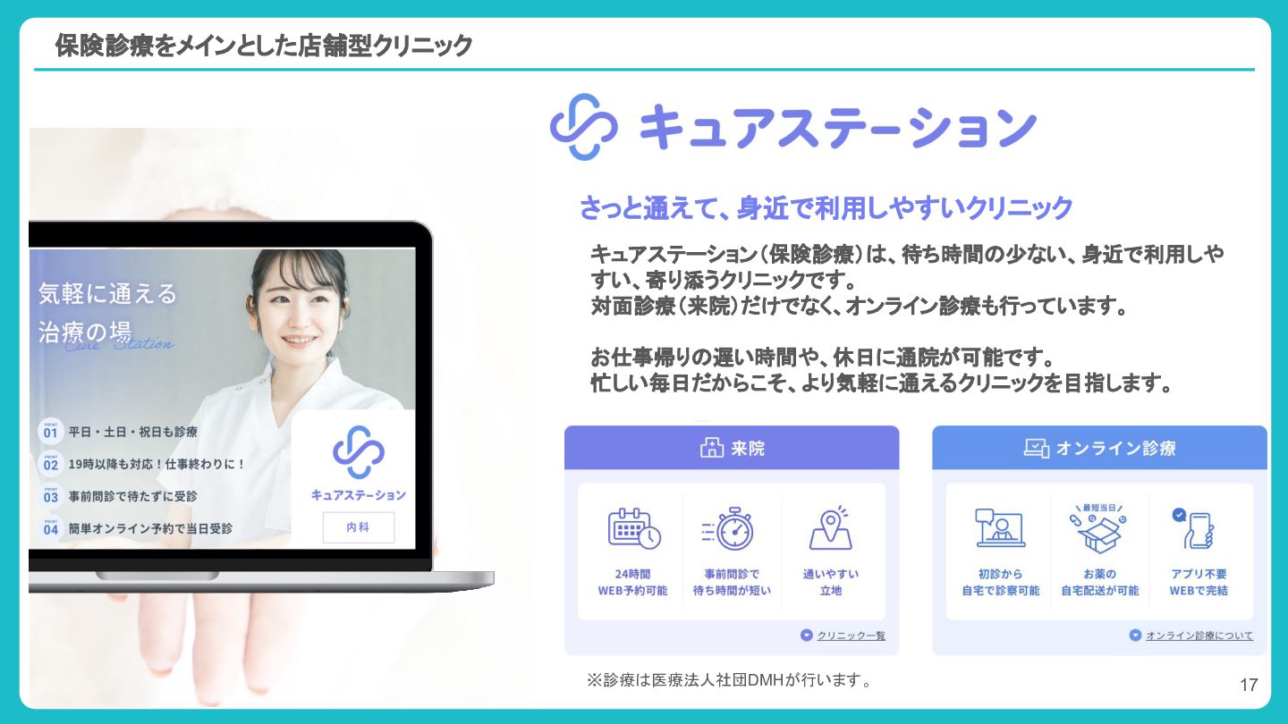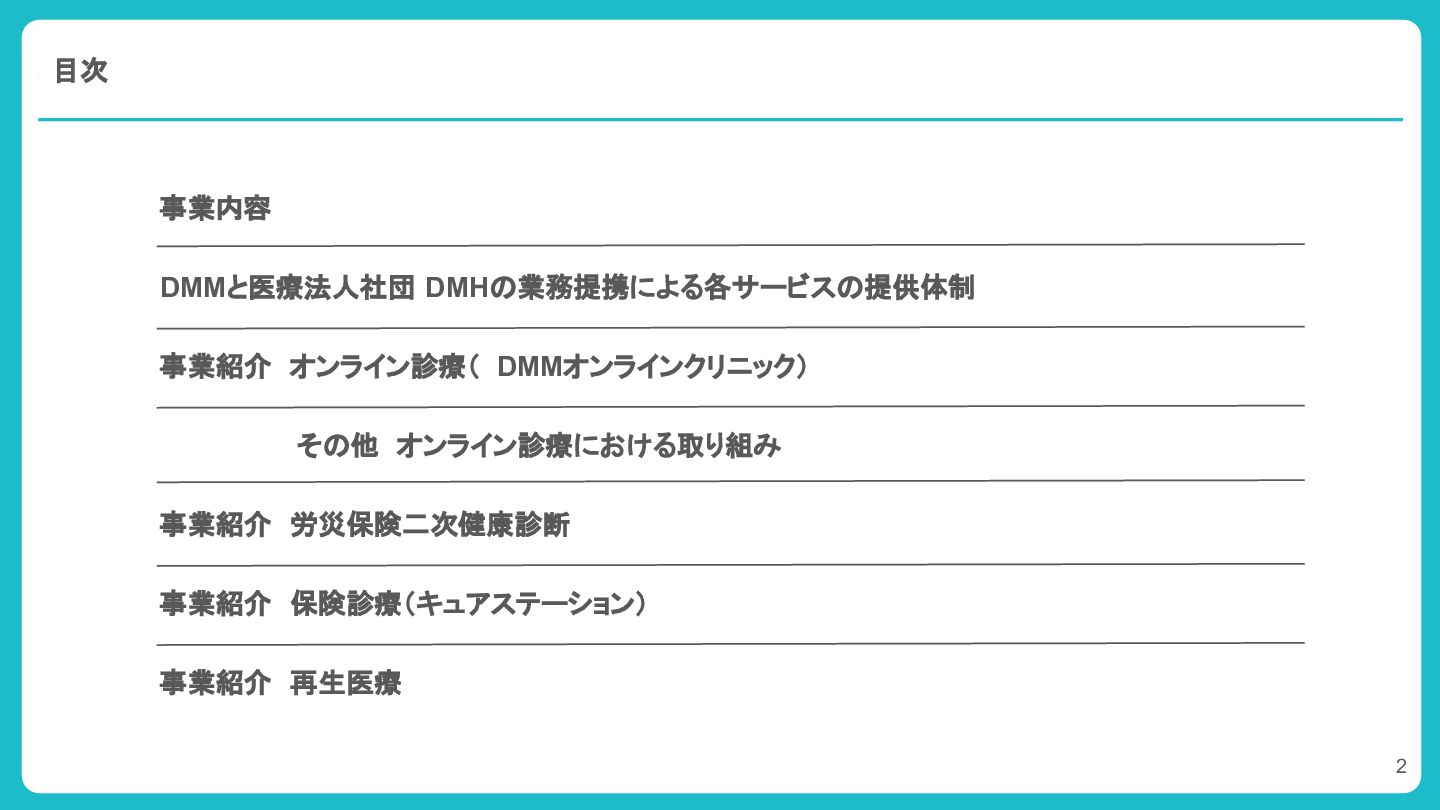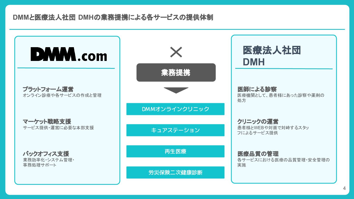 1. DMMと医療法人社団 DMHの業務提携による各サービスの提供体制 医療法人社団 DMH 業務提携 プラットフォーム運営 オンライン診療や各サービスの作成と管理 マーケット戦略支援 サービス提供・運営に必要な本部支援 バックオフィス支援