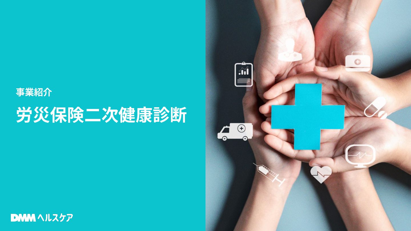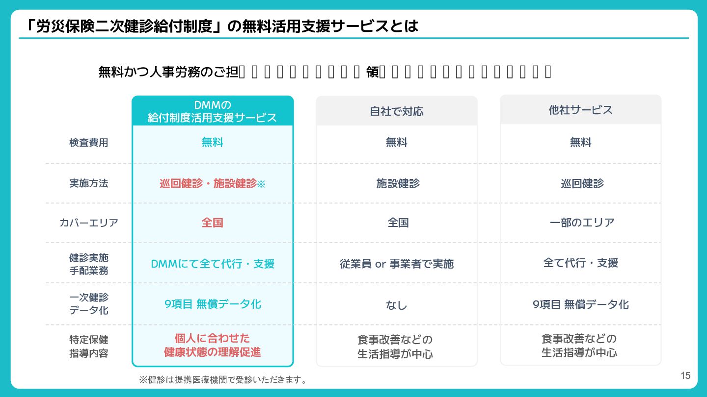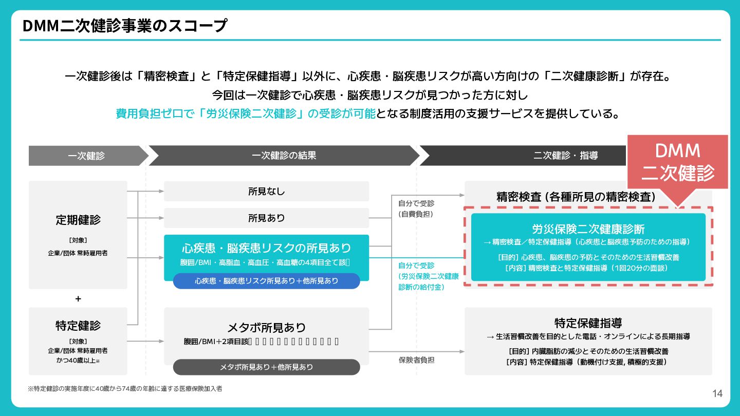 常時雇用者 特定健診 [対象] 企業/団体 常時雇用者 かつ40歳以上※ + 所見なし 所見あり 心疾患・脳疾患リスクの所見あり 腹囲/BMI・高脂血・高血圧・高血糖の4項目全て該当 心疾患・脳疾患リスク所見あり+他所見あり メタボ所見あり 腹囲/BMI+2項目該当(高脂血・高血圧・高血糖) メタボ所見あり+他所見あり 保険者負担 自分で受診 (労災保険二次健康 診断の給付金) 自分で受診 (自費負担) ※特定健診の実施年度に40歳から74歳の年齢に達する医療保険加入者 特定保健指導 → 生活習慣改善を目的とした電話・オンラインによる長期指導 [目的] 内臓脂肪の減少とそのための生活習慣改善    [内容] 特定保健指導(動機付け支援, 積極的支援)   労災保険二次健康診断 → 精密検査/特定保健指導(心疾患と脳疾患予防のための指導) [目的] 心疾患、脳疾患の予防とそのための生活習慣改善 [内容] 精密検査と特定保健指導(1回20分の面談) 精密検査 (各種所見の精密検査) DMM 二次健診 14