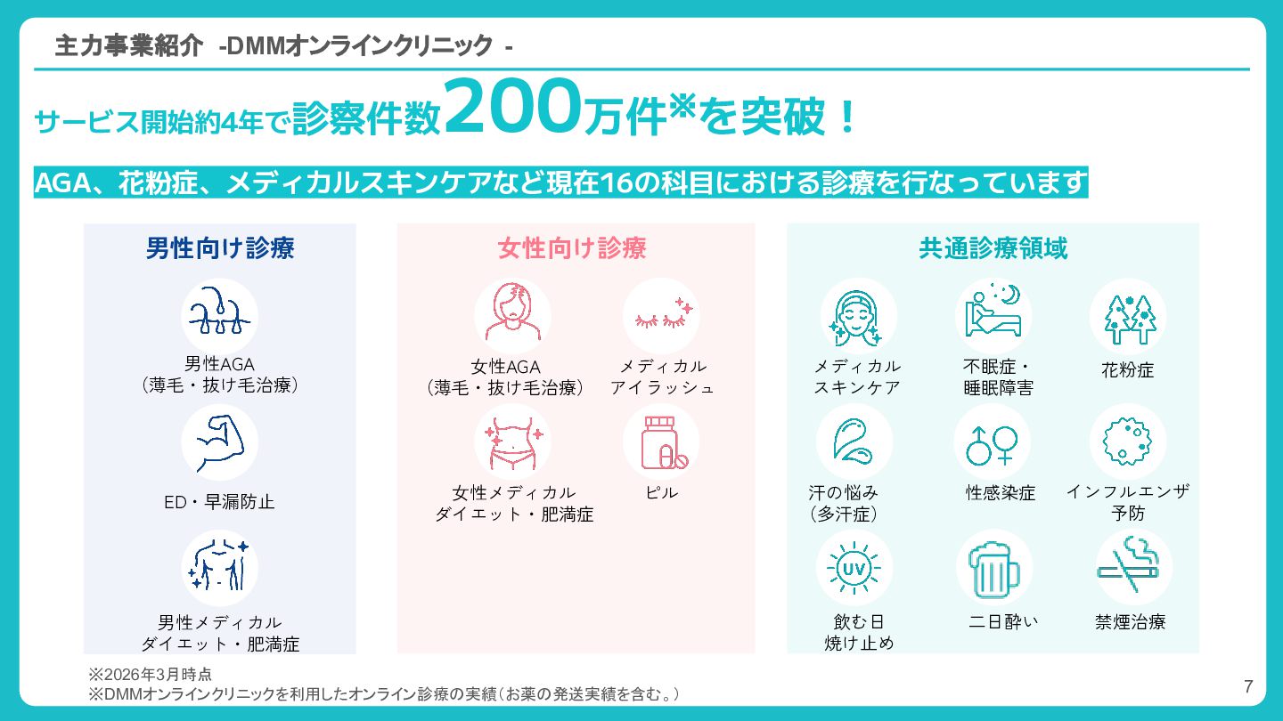 2. 主力事業紹介 -DMMオンラインクリニック - サービス開始約4年で診察件数 200万件※を突破! AGA、花粉症、メディカルスキンケアなど現在16の科目における診療を行なっています 男性AGA (薄毛・抜け毛治療) ED・早漏防止 男性向け診療