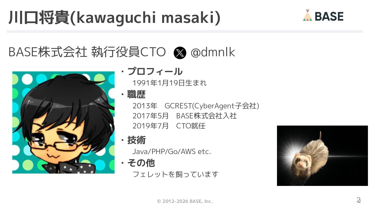 2 © 2012-2026 BASE, Inc. 2 川口将貴(kawaguchi masaki) BASE株式会社 執行役員CTO @dmnlk