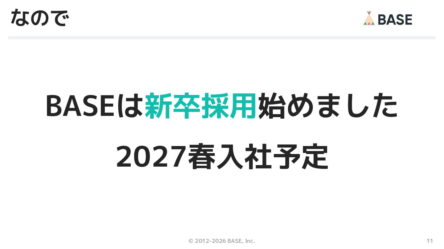 11 © 2012-2026 BASE, Inc. なので BASEは新卒採用始めました 2027春入社予定