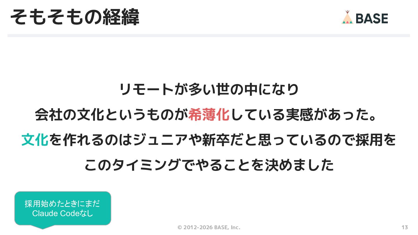 13 © 2012-2026 BASE, Inc. そもそもの経緯 リモートが多い世の中になり 会社の文化というものが希薄化している実感があった。 文化を作れるのはジュニアや新卒だと思っているので採用を このタイミングでやることを決めました