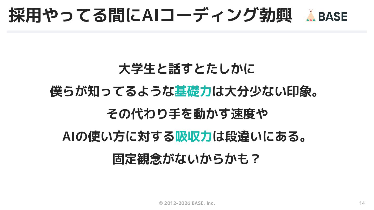 14 © 2012-2026 BASE, Inc. 採用やってる間にAIコーディング勃興 大学生と話すとたしかに 僕らが知ってるような基礎力は大分少ない印象。 その代わり手を動かす速度や AIの使い方に対する吸収力は段違いにある。