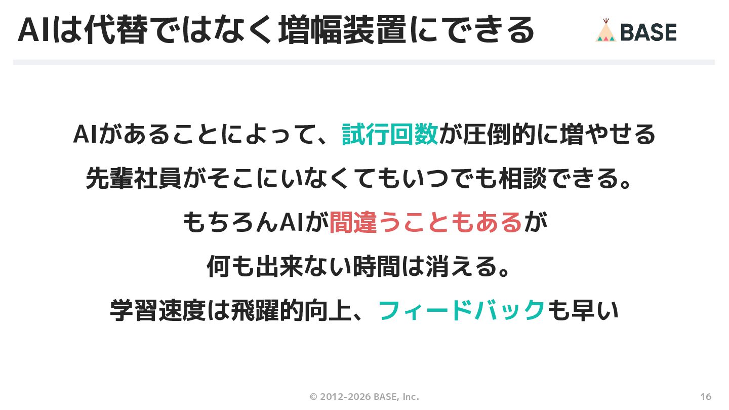 16 © 2012-2026 BASE, Inc. AIは代替ではなく増幅装置にできる AIがあることによって、試行回数が圧倒的に増やせる 先輩社員がそこにいなくてもいつでも相談できる。 もちろんAIが間違うこともあるが 何も出来ない時間は消える。