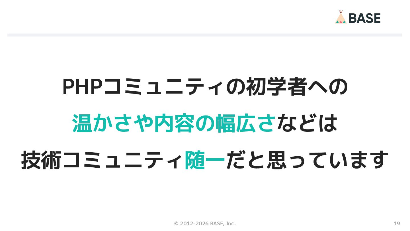 19 © 2012-2026 BASE, Inc. PHPコミュニティの初学者への 温かさや内容の幅広さなどは 技術コミュニティ随一だと思っています