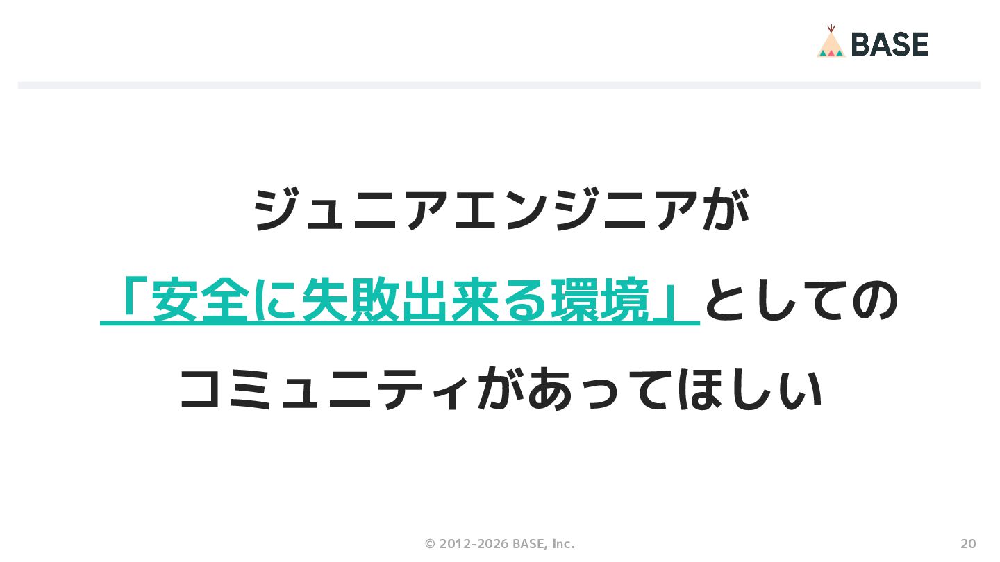 20 © 2012-2026 BASE, Inc. ジュニアエンジニアが 「安全に失敗出来る環境」としての コミュニティがあってほしい