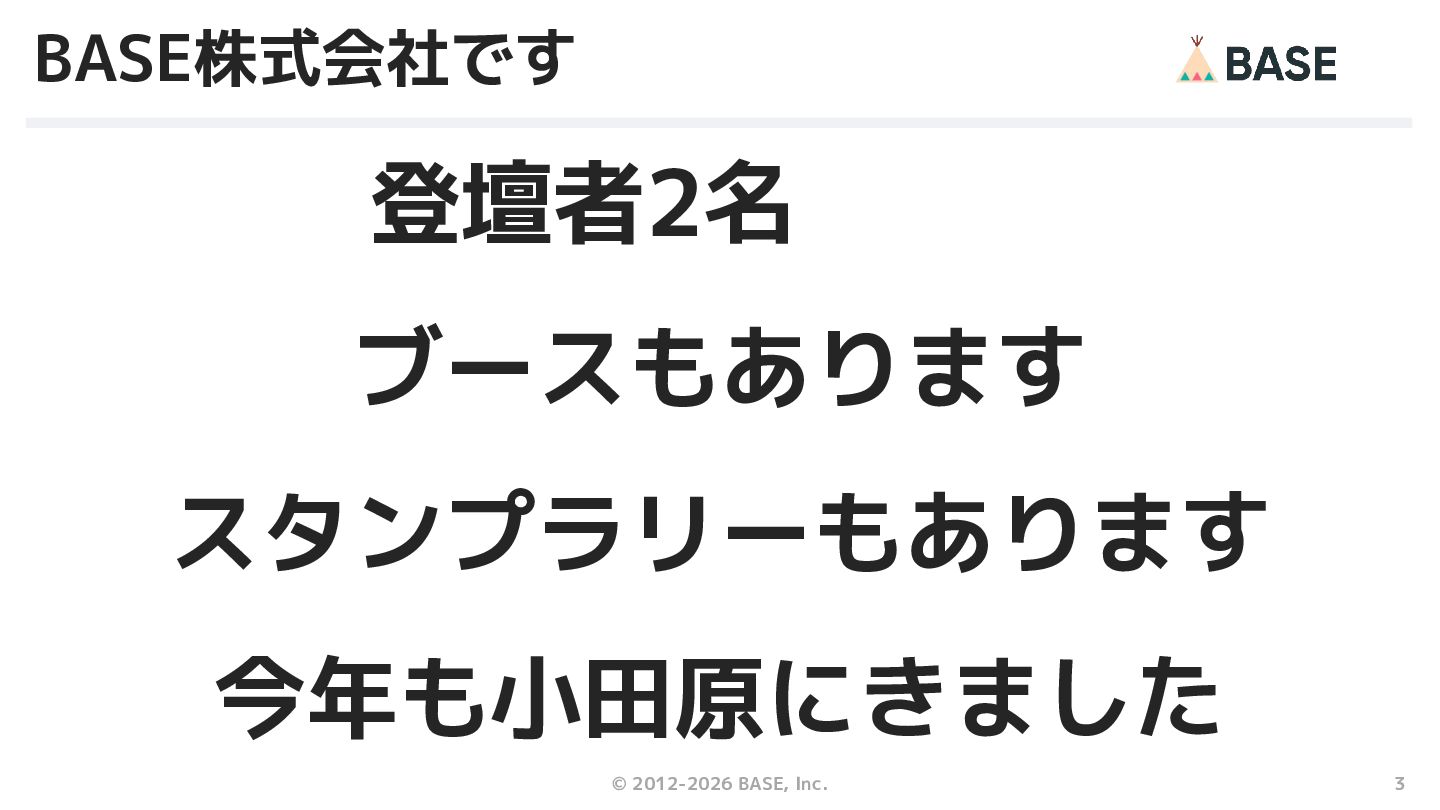 3 © 2012-2026 BASE, Inc. BASE株式会社です 登壇者2名います ブースもあります スタンプラリーもあります 今年も小田原にきました