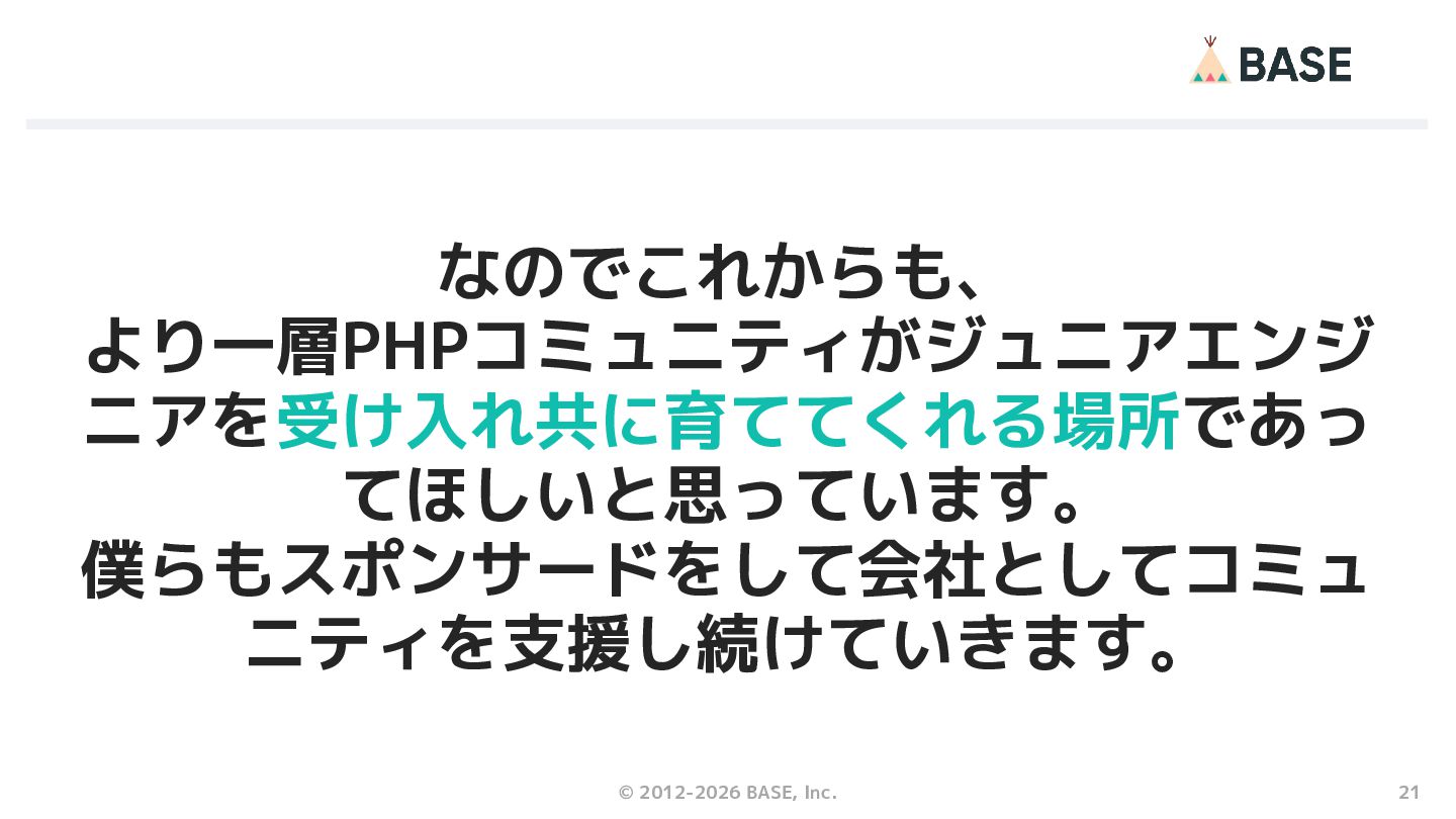 21 © 2012-2026 BASE, Inc. なのでこれからも、 より一層PHPコミュニティがジュニアエンジ ニアを受け入れ共に育ててくれる場所であっ てほしいと思っています。 僕らもスポンサードをして会社としてコミュ