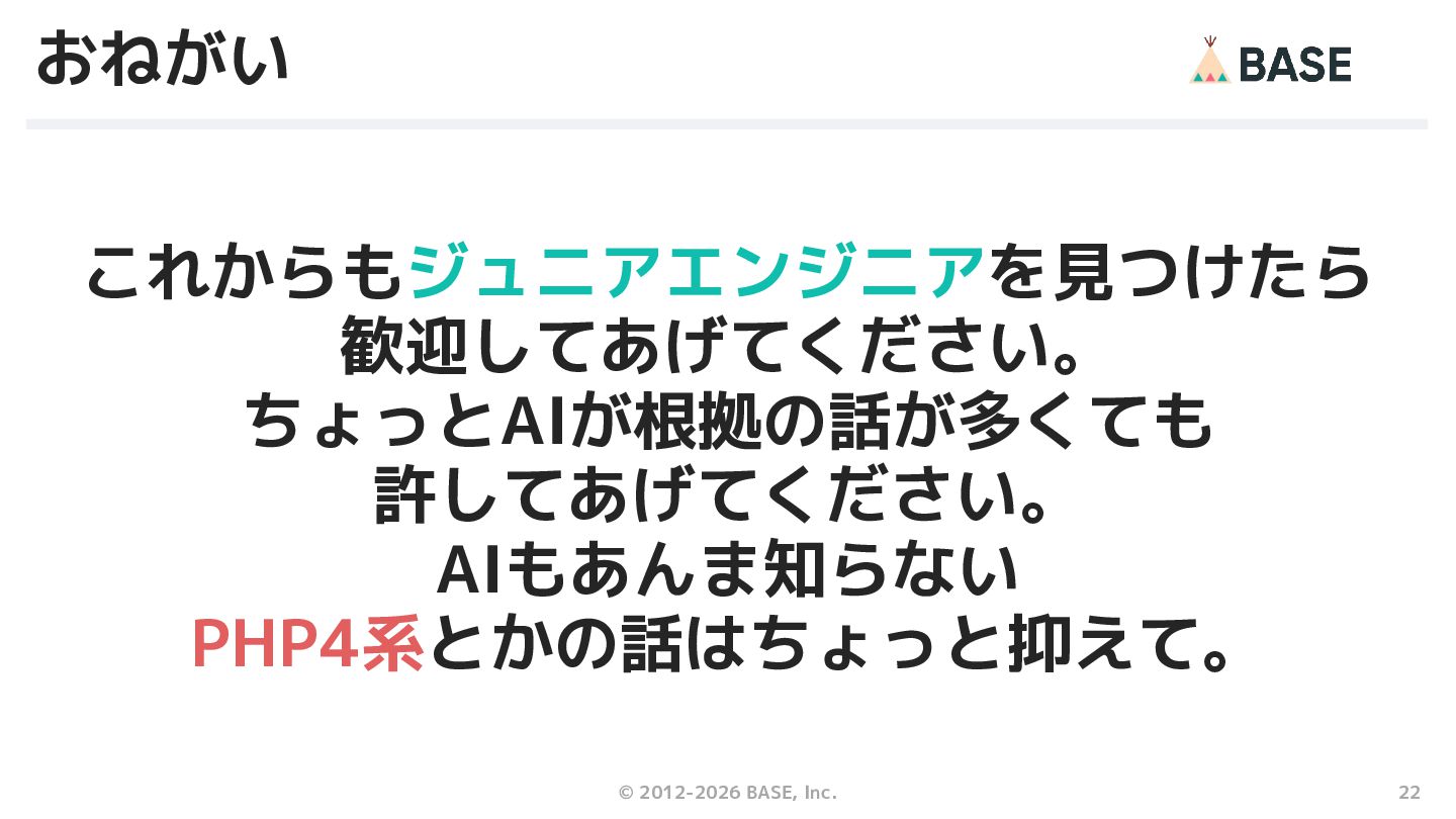22 © 2012-2026 BASE, Inc. おねがい これからもジュニアエンジニアを見つけたら 歓迎してあげてください。 ちょっとAIが根拠の話が多くても 許してあげてください。