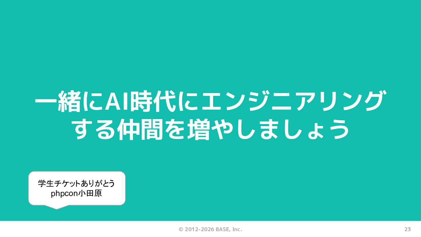 23 © 2012-2026 BASE, Inc. 一緒にAI時代にエンジニアリング する仲間を増やしましょう 学生チケットありがとう phpcon小田原