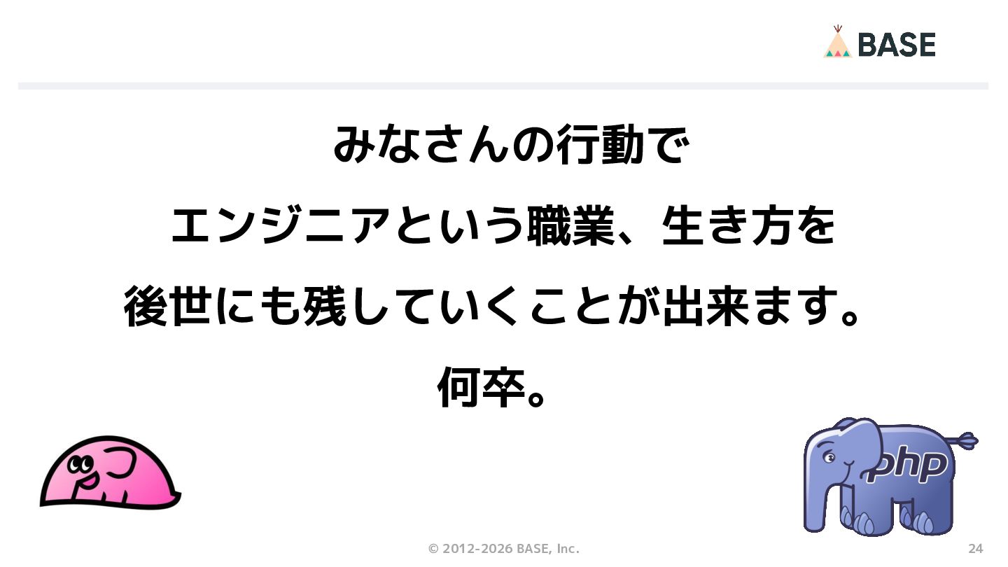 24 © 2012-2026 BASE, Inc. みなさんの行動で エンジニアという職業、生き方を 後世にも残していくことが出来ます。 何卒。