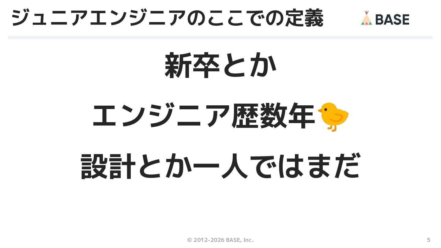 5 © 2012-2026 BASE, Inc. ジュニアエンジニアのここでの定義 新卒とか エンジニア歴数年🐤 設計とか一人ではまだ