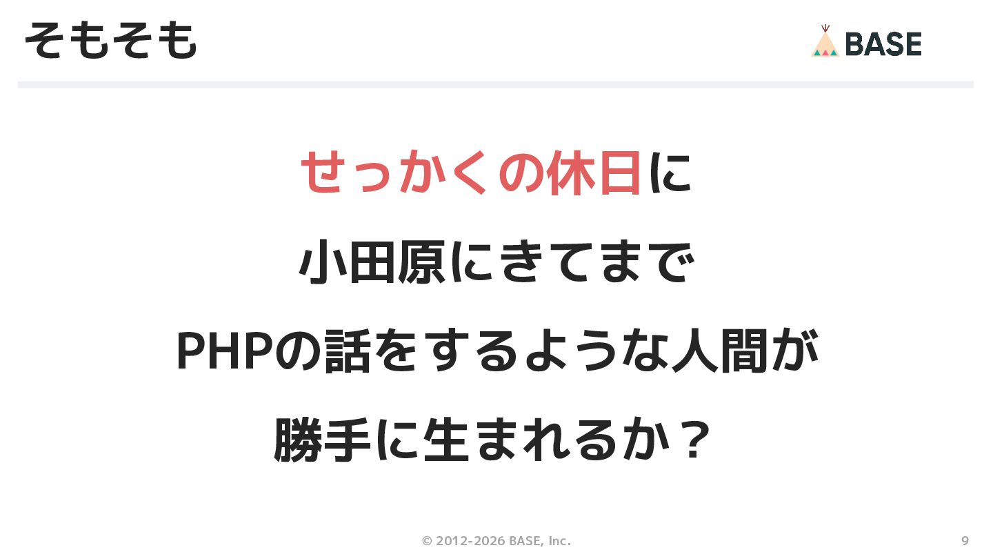 9 © 2012-2026 BASE, Inc. そもそも せっかくの休日に 小田原にきてまで PHPの話をするような人間が 勝手に生まれるか?