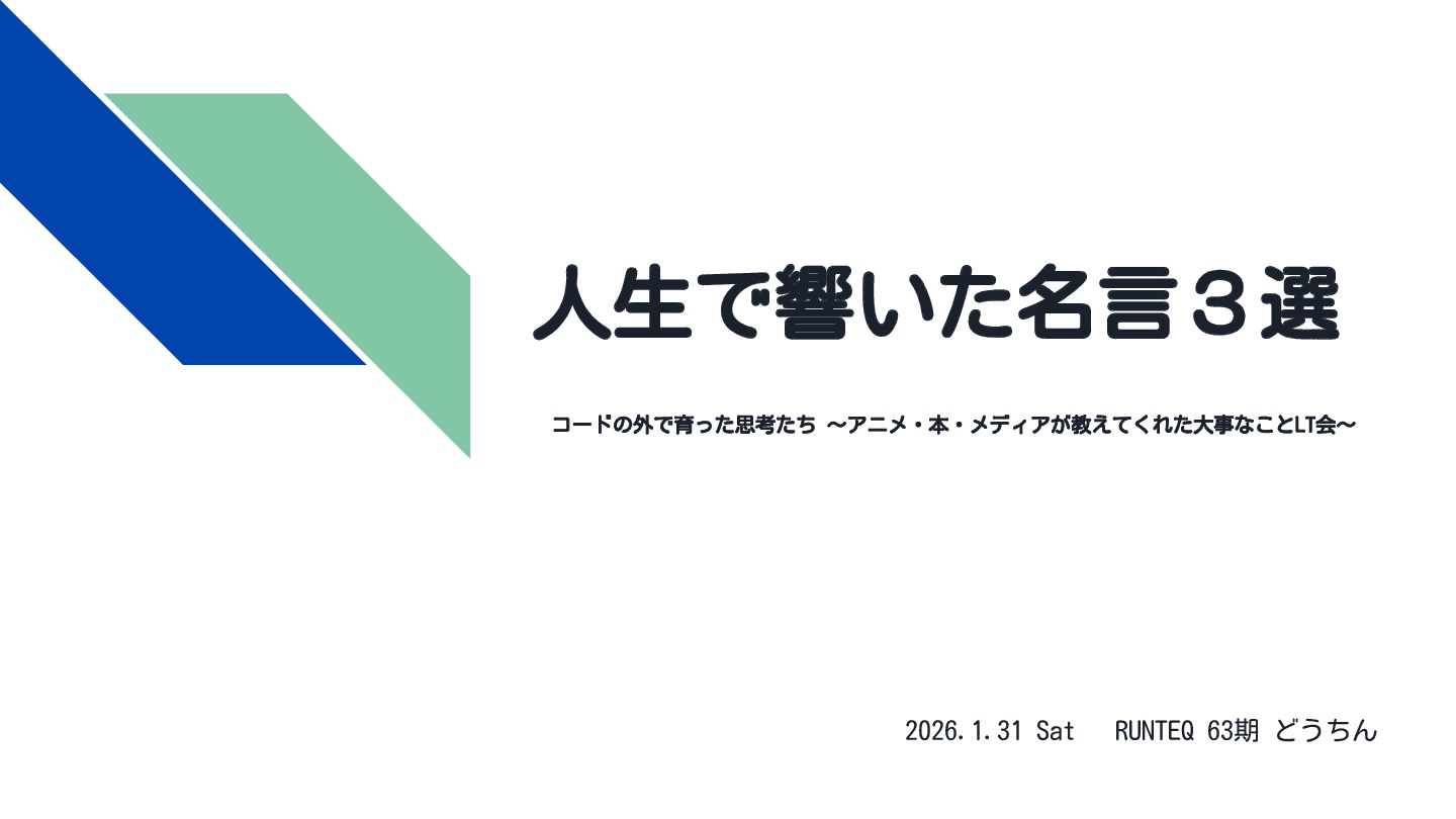 人生で響いた名言3選 コードの外で育った思考たち 〜アニメ・本・メディアが教えてくれた大事なことLT会〜 2026.1.31 Sat RUNTEQ 63期 どうちん