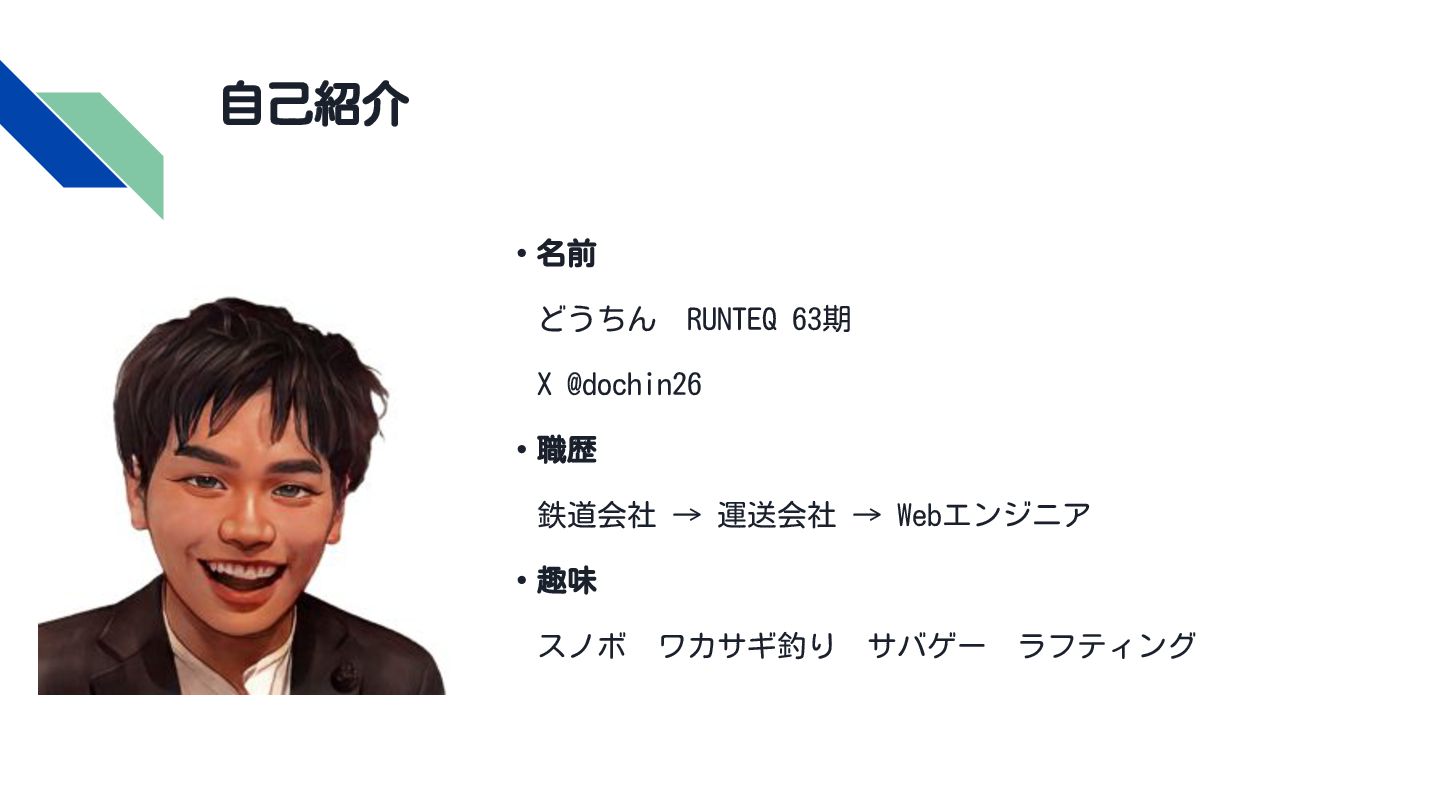 自己紹介 ・名前 どうちん RUNTEQ 63期 X @dochin26 ・職歴 鉄道会社 → 運送会社