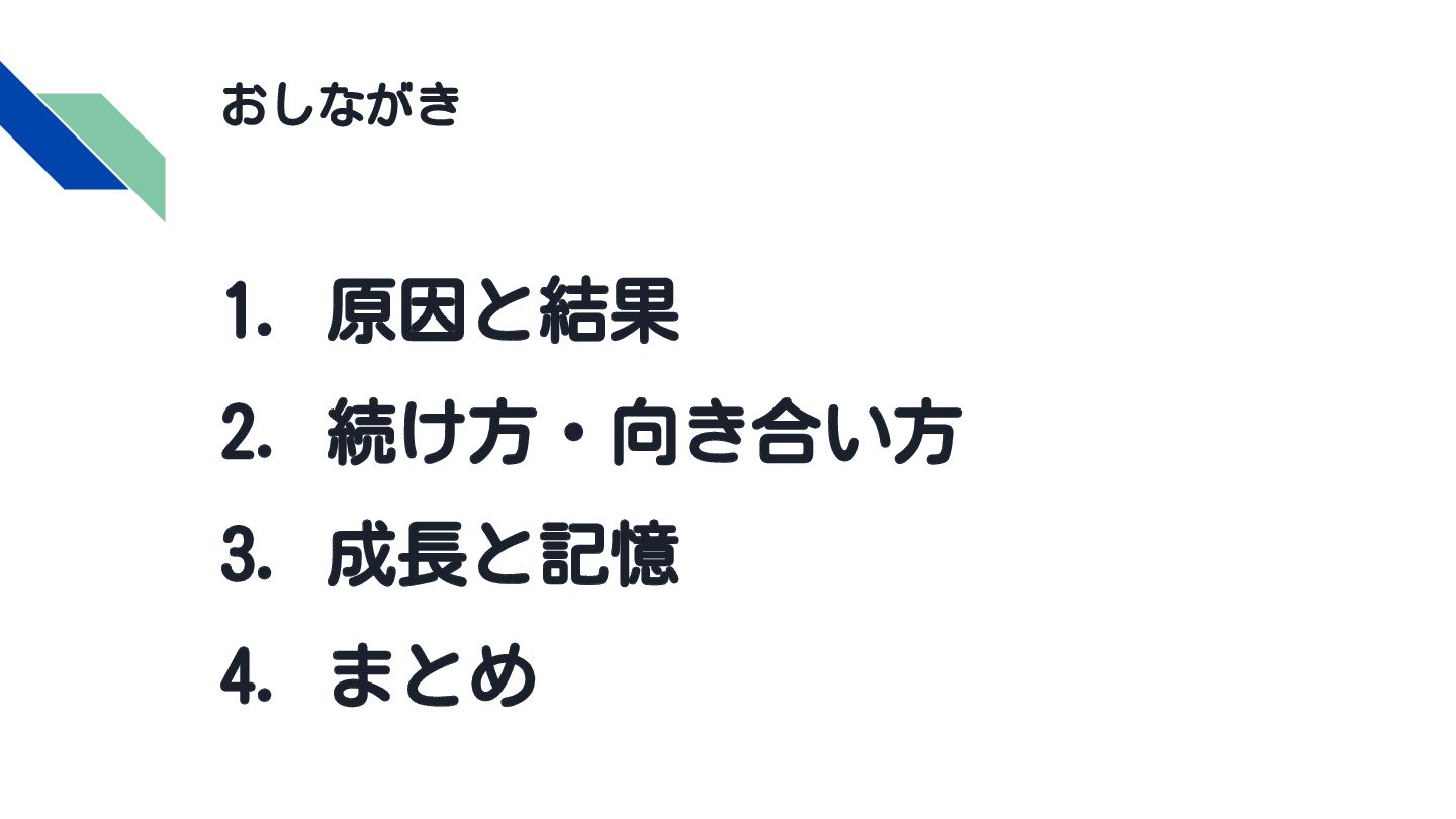 おしながき 1. 原因と結果 2. 続け方・向き合い方 3. 成長と記憶 4. まとめ