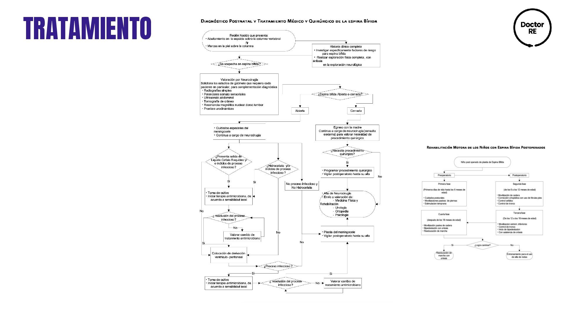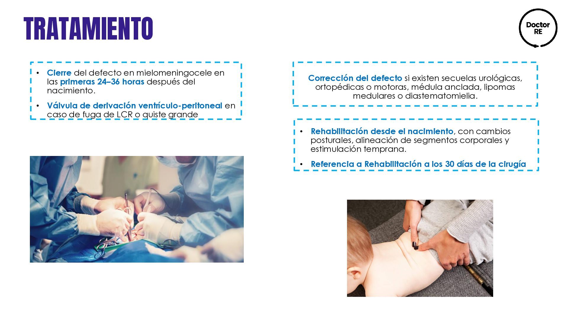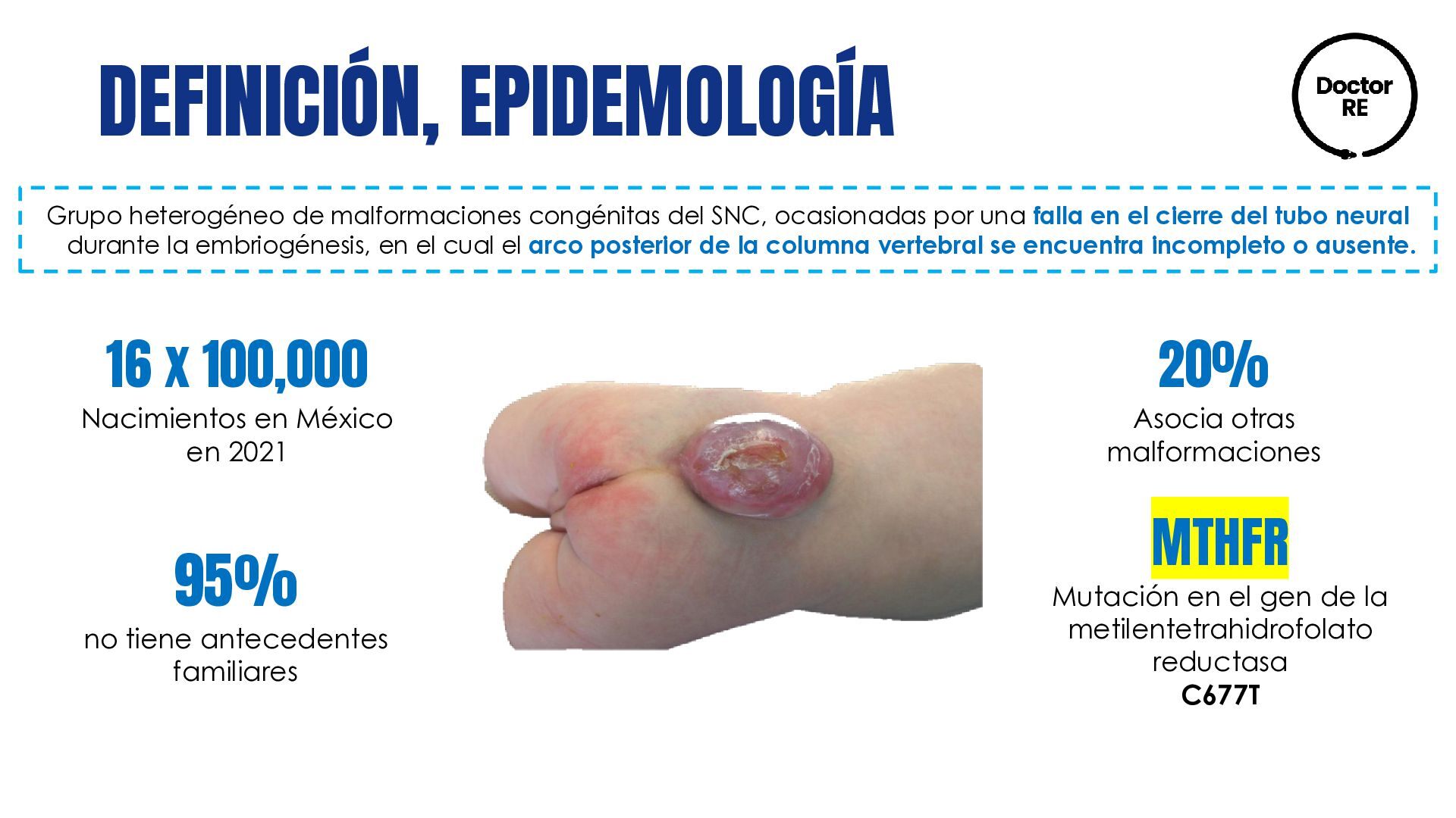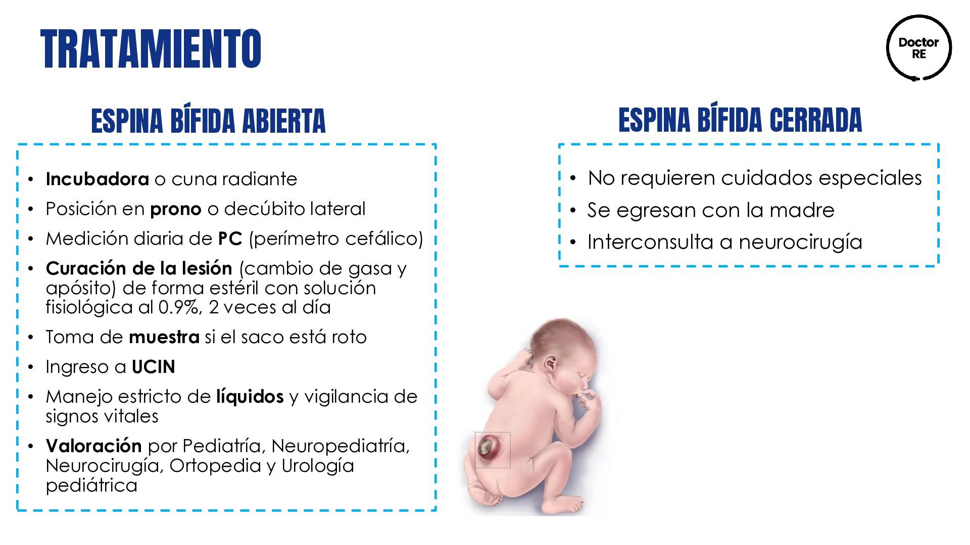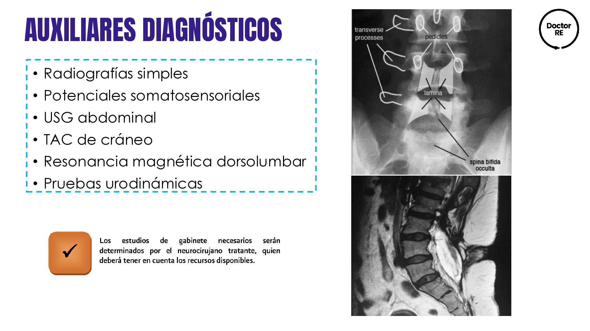 dérmico congénito Meningocele (solo meninges) Lipomielomeningocele Mielomeningocele (médula y meninges) Médula anclada Diastematomielia (médula espinal hendida) Lipoma lumbosacro Quiste neuroentérico Asintomática o con clínica asociada: cifoescoliosis, lumbociática, pie equinovaro, asimetría de extremidades inferiores, signo de Babinski, úlceras tróficas y enuresis Diagnóstico al nacimiento por la presencia de un abultamiento en la espalda sobre la columna vertebral: lumbar, dorsal, cervical o combinación de estas. Diagnóstico postnatal por pediatría (exploración física): • Región de la lesión • Morfología • Presencia o ausencia de salida de líquido • Lesiones asociadas • Condiciones neurológicas