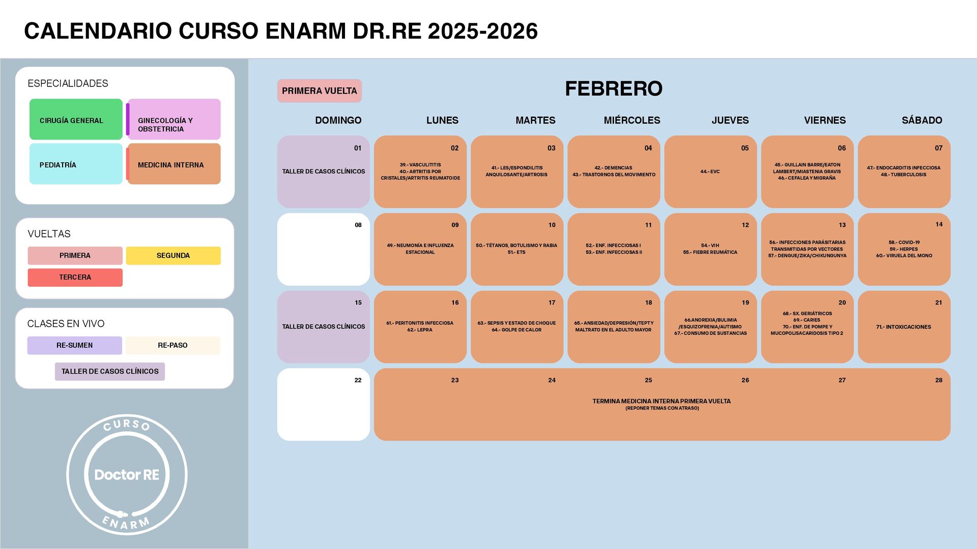 SÁBADO VIERNES JUEVES MIÉRCOLES FEBRERO MARTES LUNES DOMINGO 08 15 22 PRIMERA SEGUNDA TERCERA VUELTAS CALENDARIO CURSO ENARM DR.RE 2025-2026 ESPECIALIDADES CIRUGÍA GENERAL GINECOLOGÍA Y OBSTETRICIA PEDIATRÍA MEDICINA INTERNA 01 RE-SUMEN RE-PASO CLASES EN VIVO TALLER DE CASOS CLÍNICOS TERMINA MEDICINA INTERNA PRIMERA VUELTA (REPONER TEMAS CON ATRASO) 25 24 23 28 27 26 07 06 05 04 O3 02 47.- ENDOCARDITIS INFECCIOSA 48.- TUBERCULOSIS 45.- GUILLAIN BARRE/EATON LAMBERT/MIASTENIA GRAVIS 46.- CEFALEA Y MIGRAÑA 58.- COVID-19 59.- HERPES 60.- VIRUELA DEL MONO 56.- INFECCIONES PARÁSITARIAS TRANSMITIDAS POR VECTORES 57.- DENGUE/ZIKA/CHIKUNGUNYA 71.- INTOXICACIONES 68.- SX. GERIÁTRICOS 69.- CARIES 70.- ENF. DE POMPE Y MUCOPOLISACARIDOSIS TIPO 2 44.- EVC 54.- VIH 55.- FIEBRE REUMÁTICA 66.ANOREXIA/BULIMIA /ESQUIZOFRENIA/AUTISMO 67.- CONSUMO DE SUSTANCIAS 42.- DEMENCIAS 43.- TRASTORNOS DEL MOVIMIENTO 52.- ENF. INFECCIOSAS I 53.- ENF. INFECCIOSAS II 65.- ANSIEDAD/DEPRESIÓN/TEPT Y MALTRATO EN EL ADULTO MAYOR 41.- LES/ESPONDILITIS ANQUILOSANTE/ARTROSIS 50.- TÉTANOS, BOTULISMO Y RABIA 51.- ETS 63.- SEPSIS Y ESTADO DE CHOQUE 64.- GOLPE DE CALOR 39.- VASCULITITIS 40.- ARTRITIS POR CRISTALES/ARTRITIS REUMATOIDE 49.- NEUMONÍA E INFLUENZA ESTACIONAL 61.- PERITONITIS INFECCIOSA 62.- LEPRA 07 06 14 13 21 20 05 12 19 04 11 18 03 10 17 02 09 16