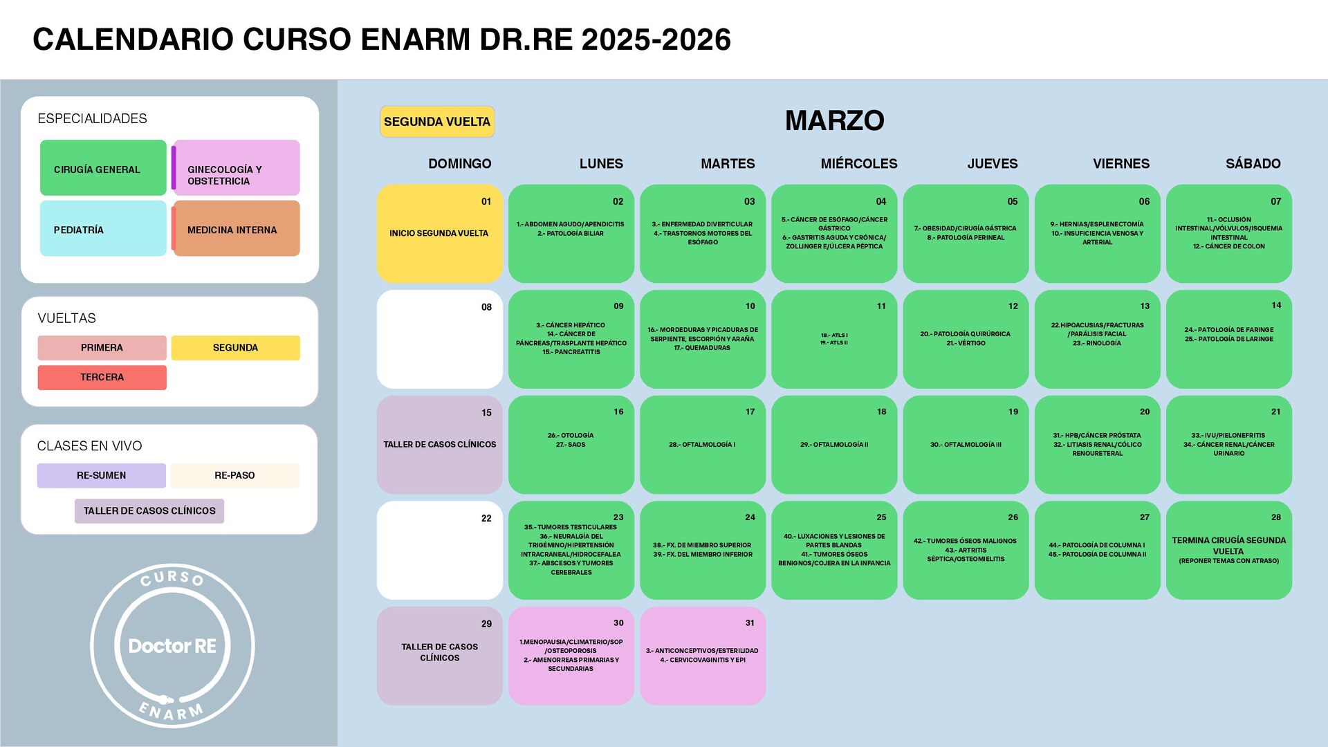 VIERNES JUEVES MIÉRCOLES MARZO MARTES LUNES 01 DOMINGO 08 15 22 29 PRIMERA SEGUNDA TERCERA VUELTAS ESPECIALIDADES CIRUGÍA GENERAL GINECOLOGÍA Y OBSTETRICIA PEDIATRÍA MEDICINA INTERNA CALENDARIO CURSO ENARM DR.RE 2025-2026 TALLER DE CASOS CLÍNICOS RE-SUMEN RE-PASO CLASES EN VIVO TALLER DE CASOS CLÍNICOS 11.- OCLUSIÓN INTESTINAL/VÓLVULOS/ISQUEMIA INTESTINAL 12.- CÁNCER DE COLON 9.- HERNIAS/ESPLENECTOMÍA 10.- INSUFICIENCIA VENOSA Y ARTERIAL 24.- PATOLOGÍA DE FARINGE 25.- PATOLOGÍA DE LARINGE 22.HIPOACUSIAS/FRACTURAS /PARÁLISIS FACIAL 23.- RINOLOGÍA 33.- IVU/PIELONEFRITIS 34.- CÁNCER RENAL/CÁNCER URINARIO 31.- HPB/CÁNCER PRÓSTATA 32.- LITIASIS RENAL/CÓLICO RENOURETERAL TERMINA CIRUGÍA SEGUNDA VUELTA (REPONER TEMAS CON ATRASO) 44.- PATOLOGÍA DE COLUMNA I 45.- PATOLOGÍA DE COLUMNA II 7.- OBESIDAD/CIRUGÍA GÁSTRICA 8.- PATOLOGÍA PERINEAL 20.- PATOLOGÍA QUIRÚRGICA 21.- VÉRTIGO 30.- OFTALMOLOGÍA III 42.- TUMORES ÓSEOS MALIGNOS 43.- ARTRITIS SÉPTICA/OSTEOMIELITIS 5.- CÁNCER DE ESÓFAGO/CÁNCER GÁSTRICO 6.- GASTRITIS AGUDA Y CRÓNICA/ ZOLLINGER E/ÚLCERA PÉPTICA 18.- ATLS I 19.- ATLS II 29.- OFTALMOLOGÍA II 40.- LUXACIONES Y LESIONES DE PARTES BLANDAS 41.- TUMORES ÓSEOS BENIGNOS/COJERA EN LA INFANCIA 3.- ENFERMEDAD DIVERTICULAR 4.- TRASTORNOS MOTORES DEL ESÓFAGO 16.- MORDEDURAS Y PICADURAS DE SERPIENTE, ESCORPIÓN Y ARAÑA 17.- QUEMADURAS 28.- OFTALMOLOGÍA I 38.- FX. DE MIEMBRO SUPERIOR 39.- FX. DEL MIEMBRO INFERIOR 1.- ABDOMEN AGUDO/APENDICITIS 2.- PATOLOGÍA BILIAR 3.- CÁNCER HEPÁTICO 14.- CÁNCER DE PÁNCREAS/TRASPLANTE HEPÁTICO 15.- PANCREATITIS 26.- OTOLOGÍA 27.- SAOS 35.- TUMORES TESTICULARES 36.- NEURALGÍA DEL TRIGÉMINO/HIPERTENSIÓN INTRACRANEAL/HIDROCEFALEA 37.- ABSCESOS Y TUMORES CEREBRALES 07 06 14 13 21 20 28 27 05 12 19 26 04 11 18 25 03 10 17 24 02 09 16 23 3.- ANTICONCEPTIVOS/ESTERILIDAD 4.- CERVICOVAGINITIS Y EPI 1.MENOPAUSIA/CLIMATERIO/SOP /OSTEOPOROSIS 2.- AMENORREAS PRIMARIAS Y SECUNDARIAS 31 30