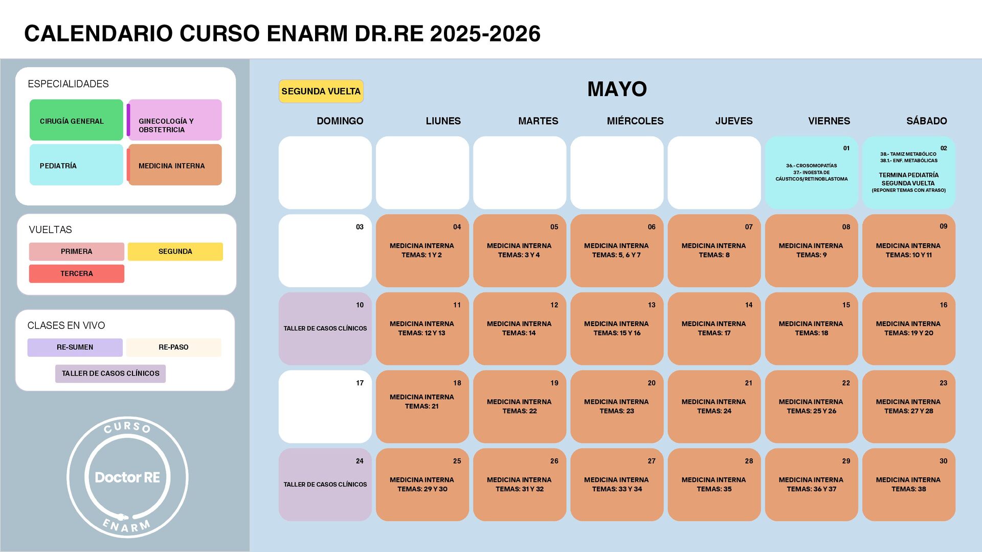 SÁBADO VIERNES JUEVES MIÉRCOLES MAYO MARTES LIUNES DOMINGO 03 10 17 24 PRIMERA SEGUNDA TERCERA VUELTAS ESPECIALIDADES CIRUGÍA GENERAL GINECOLOGÍA Y OBSTETRICIA PEDIATRÍA MEDICINA INTERNA CALENDARIO CURSO ENARM DR.RE 2025-2026 RE-SUMEN RE-PASO CLASES EN VIVO TALLER DE CASOS CLÍNICOS MEDICINA INTERNA TEMAS: 10 Y 11 MEDICINA INTERNA TEMAS: 9 MEDICINA INTERNA TEMAS: 8 MEDICINA INTERNA TEMAS: 5, 6 Y 7 MEDICINA INTERNA TEMAS: 3 Y 4 MEDICINA INTERNA TEMAS: 1 Y 2 09 08 07 06 05 04 MEDICINA INTERNA TEMAS: 19 Y 20 MEDICINA INTERNA TEMAS: 18 MEDICINA INTERNA TEMAS: 27 Y 28 MEDICINA INTERNA TEMAS: 25 Y 26 MEDICINA INTERNA TEMAS: 17 MEDICINA INTERNA TEMAS: 24 MEDICINA INTERNA TEMAS: 15 Y 16 MEDICINA INTERNA TEMAS: 23 MEDICINA INTERNA TEMAS: 33 Y 34 MEDICINA INTERNA TEMAS: 14 MEDICINA INTERNA TEMAS: 22 MEDICINA INTERNA TEMAS: 31 Y 32 MEDICINA INTERNA TEMAS: 12 Y 13 MEDICINA INTERNA TEMAS: 21 MEDICINA INTERNA TEMAS: 29 Y 30 16 15 23 22 14 21 13 20 27 12 19 26 11 18 25 MEDICINA INTERNA TEMAS: 38 MEDICINA INTERNA TEMAS: 36 Y 37 MEDICINA INTERNA TEMAS: 35 30 29 28 38.- TAMIZ METABÓLICO 38.1.- ENF. METABÓLICAS TERMINA PEDIATRÍA SEGUNDA VUELTA (REPONER TEMAS CON ATRASO) 36.- CROSOMOPATÍAS 37.- INGESTA DE CÁUSTICOS/RETINOBLASTOMA 02 01
