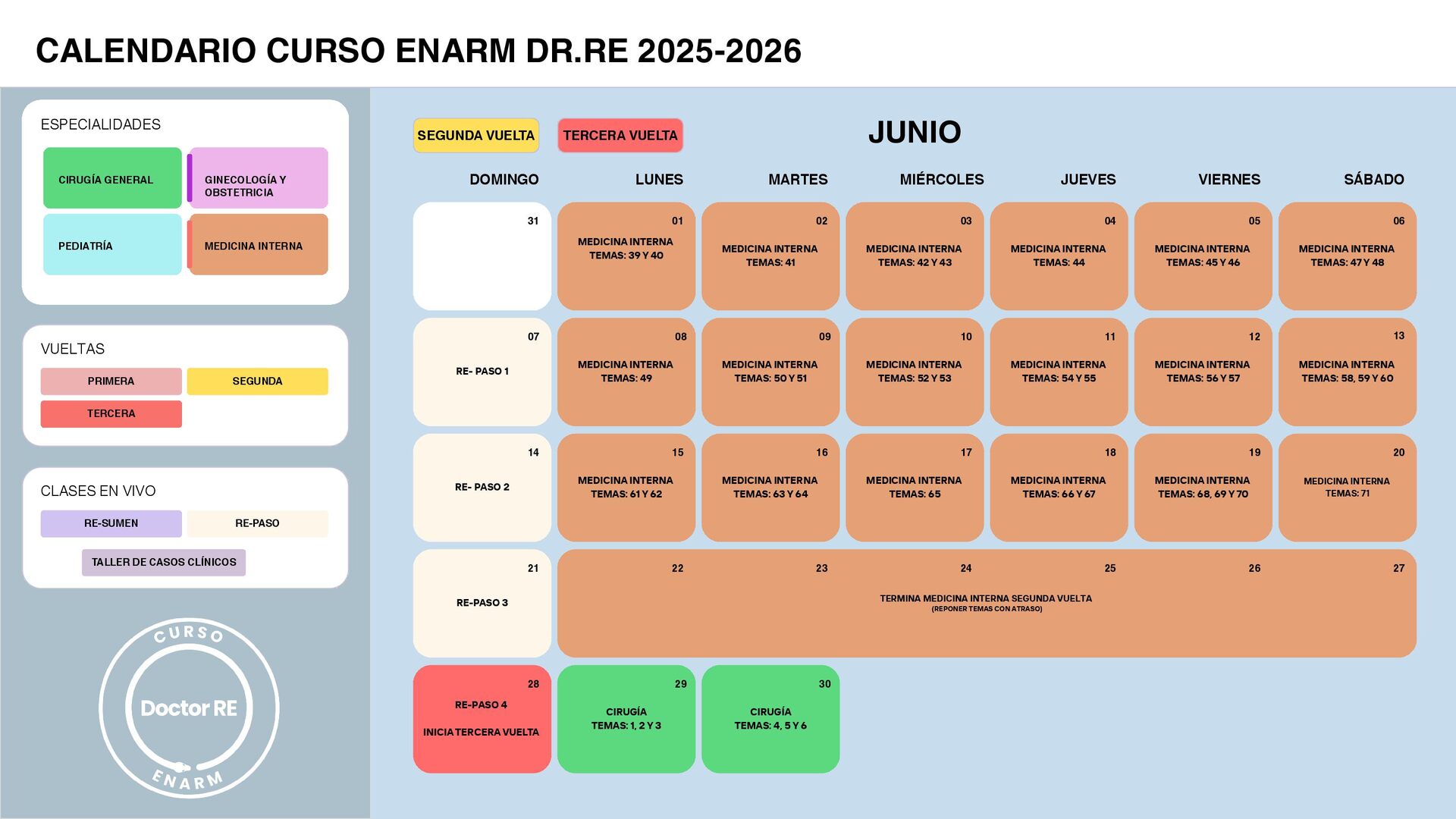 RE-PASO 4 INICIA TERCERA VUELTA SÁBADO VIERNES JUEVES MIÉRCOLES JUNIO MARTES LUNES 31 DOMINGO 07 14 21 28 PRIMERA SEGUNDA TERCERA VUELTAS ESPECIALIDADES CIRUGÍA GENERAL GINECOLOGÍA Y OBSTETRICIA PEDIATRÍA MEDICINA INTERNA CALENDARIO CURSO ENARM DR.RE 2025-2026 RE-SUMEN RE-PASO CLASES EN VIVO TALLER DE CASOS CLÍNICOS MEDICINA INTERNA TEMAS: 47 Y 48 MEDICINA INTERNA TEMAS: 45 Y 46 MEDICINA INTERNA TEMAS: 44 MEDICINA INTERNA TEMAS: 42 Y 43 MEDICINA INTERNA TEMAS: 41 MEDICINA INTERNA TEMAS: 39 Y 40 06 05 04 03 02 01 MEDICINA INTERNA TEMAS: 50 Y 51 MEDICINA INTERNA TEMAS: 49 09 08 MEDICINA INTERNA TEMAS: 58, 59 Y 60 MEDICINA INTERNA TEMAS: 56 Y 57 MEDICINA INTERNA TEMAS: 54 Y 55 MEDICINA INTERNA TEMAS: 52 Y 53 13 12 11 10 MEDICINA INTERNA TEMAS: 71 MEDICINA INTERNA TEMAS: 68, 69 Y 70 MEDICINA INTERNA TEMAS: 66 Y 67 MEDICINA INTERNA TEMAS: 65 MEDICINA INTERNA TEMAS: 63 Y 64 MEDICINA INTERNA TEMAS: 61 Y 62 20 19 18 17 16 15 TERCERA VUELTA TERMINA MEDICINA INTERNA SEGUNDA VUELTA (REPONER TEMAS CON ATRASO) 27 26 25 24 23 22 CIRUGÍA TEMAS: 4, 5 Y 6 CIRUGÍA TEMAS: 1, 2 Y 3 30 29